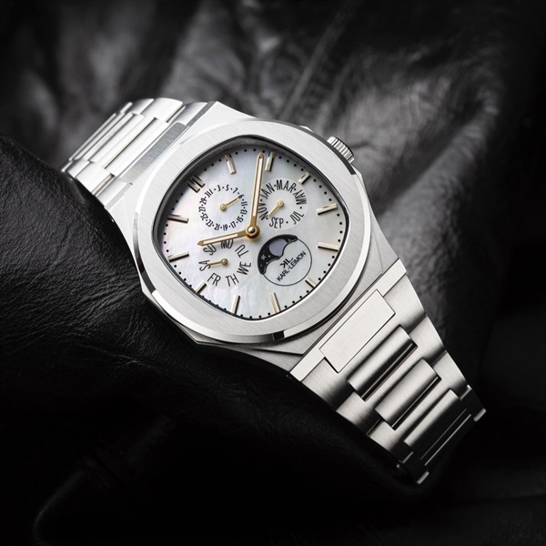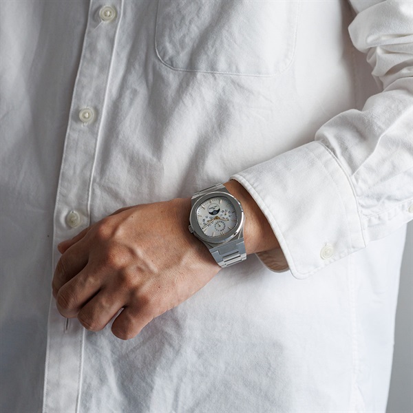 クラシックなデザイン、パーツ使い、高級時計に用いられるムーンフェイズ機能を備えており、日本でひとつひとつ丁寧に作られています。それでいて、手の届く価格設定に抑えられている腕時計 KARL-LEIMON(カルレイモン)。海外・国内のクラウドファンディングで、1,000万以上の協賛に成功。「マジェスティ」はトリプルカレンダーとムーンフェイズが最も見やすく美しい文字盤を追求し、黄金バランスの文字盤プロポーションにこだわりました。その「マジェスティ」をベースに、ブランド初となるMOPダイヤルを採用しました。今回の別注第二弾のテーマは「夜」。太陽が沈まず世界に白い光が揺らぐ「白夜」をホワイトモデル、一日中太陽が昇らない静けさの中、時折オーロラが揺らめく「極夜」をブラックモデルで表現しました。限定100本。