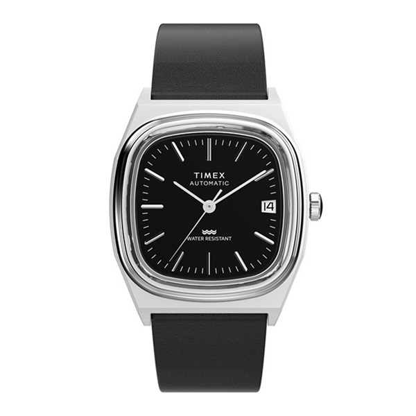 シンプルに見えて実は凝った作りのケースは、いま世界的にトレンドとなりつつある小径の34mm幅で、オーセンティックなブラック文字盤に合わせてレザーストラップもブラックのまさに汎用性の高い1本。