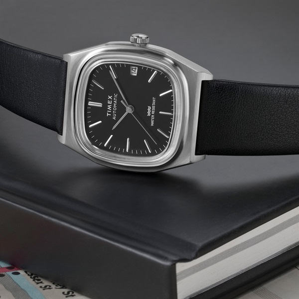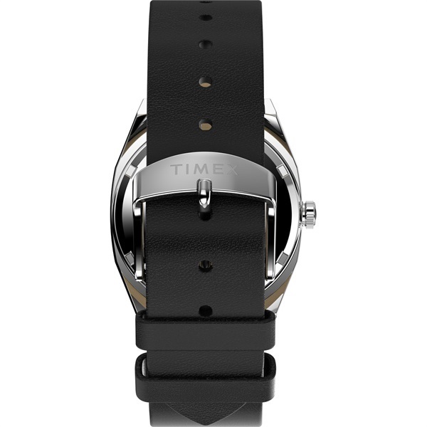 シンプルに見えて実は凝った作りのケースは、いま世界的にトレンドとなりつつある小径の34mm幅で、こちらはオーセンティックなブラック文字盤に合わせてレザーストラップもブラックのまさに汎用性の高い1本。