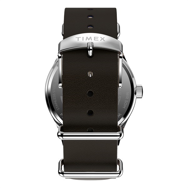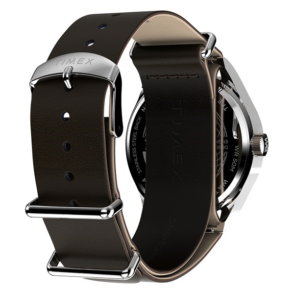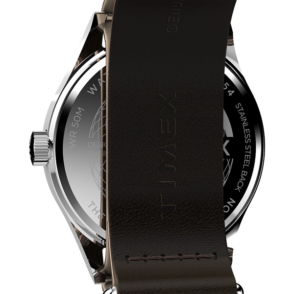 39mmのスリムなステンレススチールケースには、清潔感のあるホワイトの文字盤が合わせられ、12時間と24時間表示のインデックス、そして暗くなっても時刻を確認しやすい蓄光針を搭載しています。