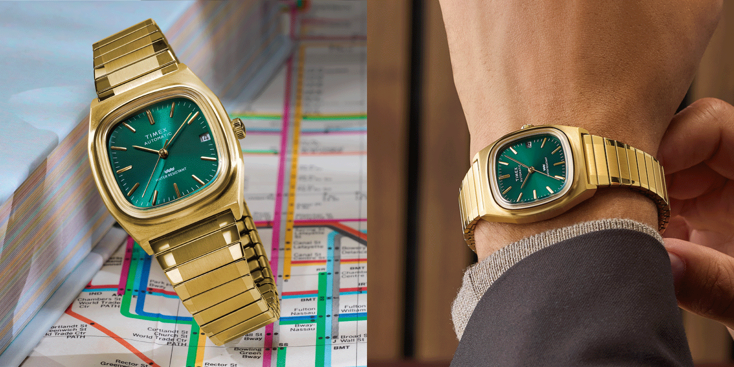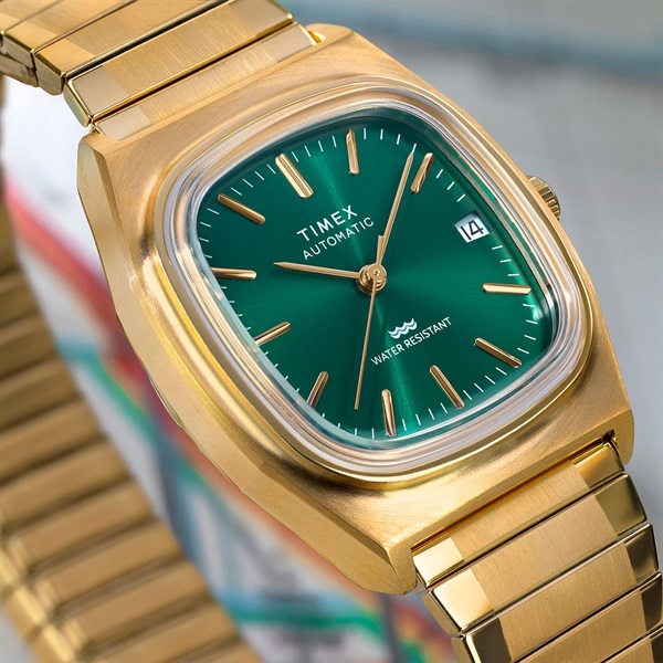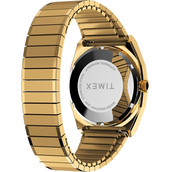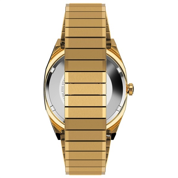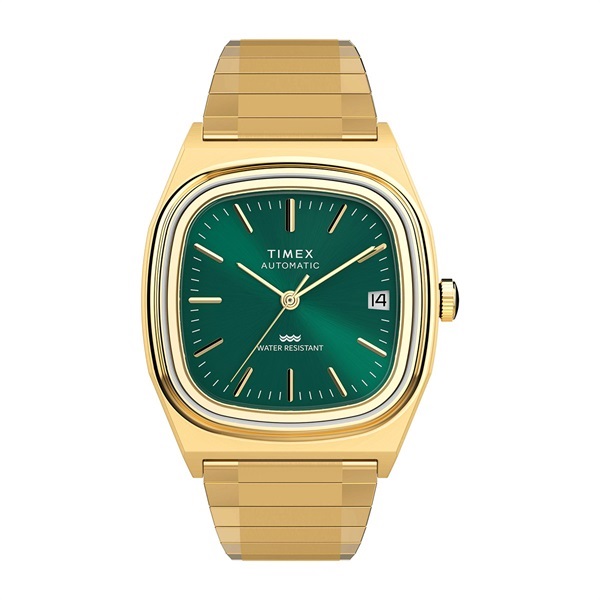 1980年代は明るい色にアンコンのスーツやデニムにシャツを合わせるなど、メンズファッションに革新が起きたことも影響し、このモデルも1983年のTIMEX本国の総合カタログでドレス向けモデルとして紹介されています。このモデルは<リイシュー/復刻>シリーズとして初めて、オリジナルが自動巻きのモデルの復刻となります。シンプルに見えてじつは凝った作りのケースはいま世界的にトレンドとなりつつある小径の34mm幅、シーズン限定カラーとしてゴールドカラーのケースにグリーンの文字盤を組み合わせました。奇しくも80年代バブル期のファッションやアイテムも再び注目を集めるいま、こうしたアーカイブが元ネタのモデルを現代のムーブメントと外装で楽しめるのは嬉しいポイントです。※裏蓋はスクリューバック(ねじ込み式)のためロゴの回転具合は写真と異なります。予めご了承ください。