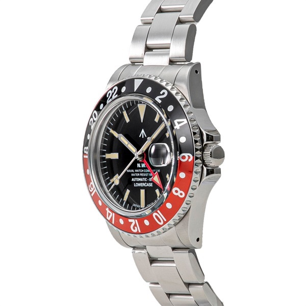 商品開発アドバイザーとして、LOWERCASEクリエイティブディレクター梶原由景氏を新たに迎え、NAVAL WATCHが得意とする本来のミリタリーウォッチデザインをベースに、ヴィンテージ感と現代的なエッセンスを絶妙なバランスでミックスさせ、時代の空気感に相応しい「アーバンミリタリーウォッチ」をコンセプトに完成させたコレクションが、「NAVAL WATCH Produced by LOWERCASE」です。FRXAモデルをベースに、GMT機構を追加しGMT針及びGMTベゼルを装備したモデル。ビンテージのGMTモデルをモチーフとしてベゼルカラー・文字盤・GMT針のカラーコンビネーションを考案いたしました。ケースサイズは回転ベゼルを持つモデルとしては大きすぎない「40.8mm径」。同時に3地点の時間帯の時刻が分かるGMT針を持ち逆回転防止機構付き24時間計用回転ベゼルを装備した本格的なGMTモデルです。(手巻き機構付き自動巻き機械式)アンティークな雰囲気を作るアクリルガラスは当時の雰囲気を忠実に再現するべく、ボックス形状+日付窓用魚眼レンズで製作しました。文字盤上の日焼けしたような蓄光塗料の表現は、ベージュ色に調色することで、ヴィンテージ感を再現しました。赤の差し色がポイントのモデルです。