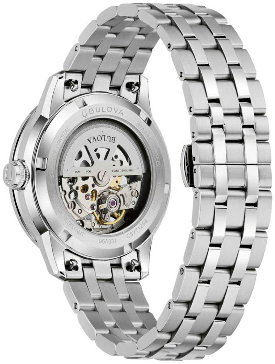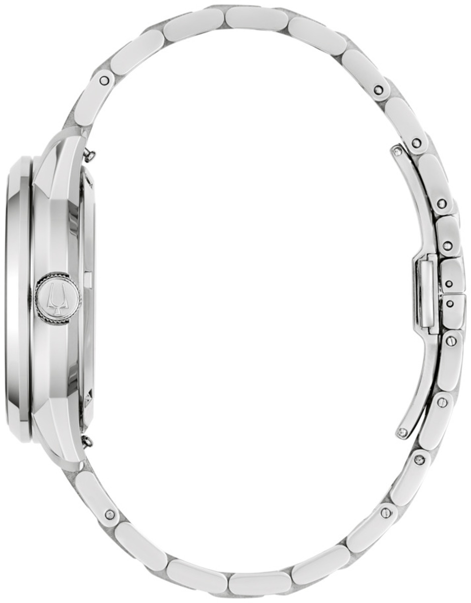 12時位置にはミラー仕上げのブローバの音叉マークを、インデックスは視認性の高いバーインデックスをセッティングし、ディテールにこだわった時計です。