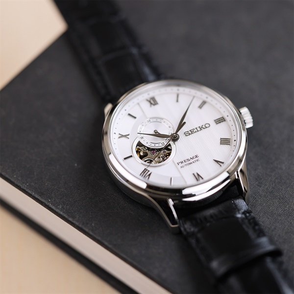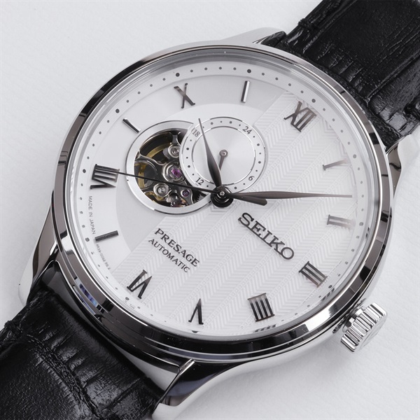 日本建築にもよく見られる丸窓を表現したオープンハートダイヤル。この窓を通して、機械式時計ならではの時の流れを目と耳で楽しむことができます。
