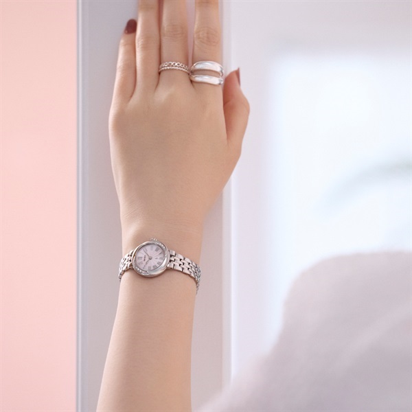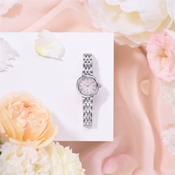 LUKIA Growから、ふっくらとした花びらが魅力の芍薬をイメージしたベゼルデザインにダイヤモンドをあしらった、ジュエリーのような魅力を持つLuxe(リュクス)な時計が新たに登場。ケースにあしらったラボグロウン・ダイヤモンドは、芍薬が花開く様を表現するベゼルデザインのカーブに沿って、サイズの異なるものをセッティング。ダイヤルは芍薬の重なり合う花びらをイメージしたギョーシェ模様を施し、さらに丁寧に美しく磨き上げることで艶感を出しています。カラーリングは柔らかいニュアンスカラーで肌馴染みがよく、腕元を美しく彩ります。約23mmの小ぶりのサイズ感は、時計としての視認性も確保しつつ、華奢で女性らしさを演出してくれます。華やかなドレスシーンから日常使いまで様々なシーンに溶け込みます。細身の多列ブレスレットは、駒ひとつひとつが丸みを帯び、艶やかに輝きます。またピッチが細かく、しっとりと腕になじみます。