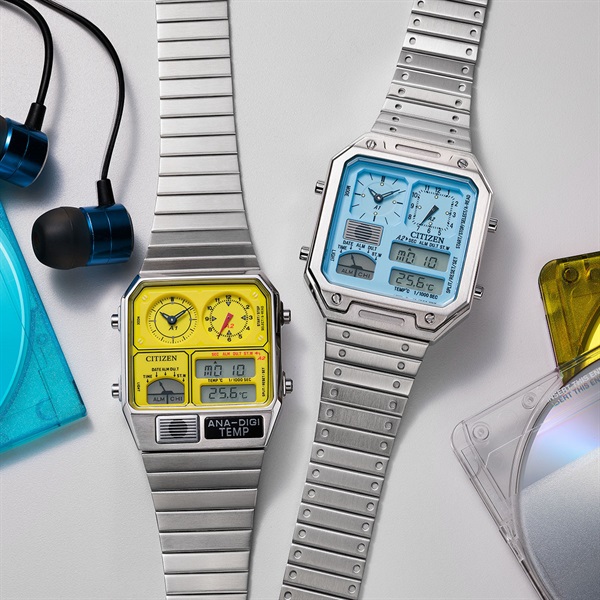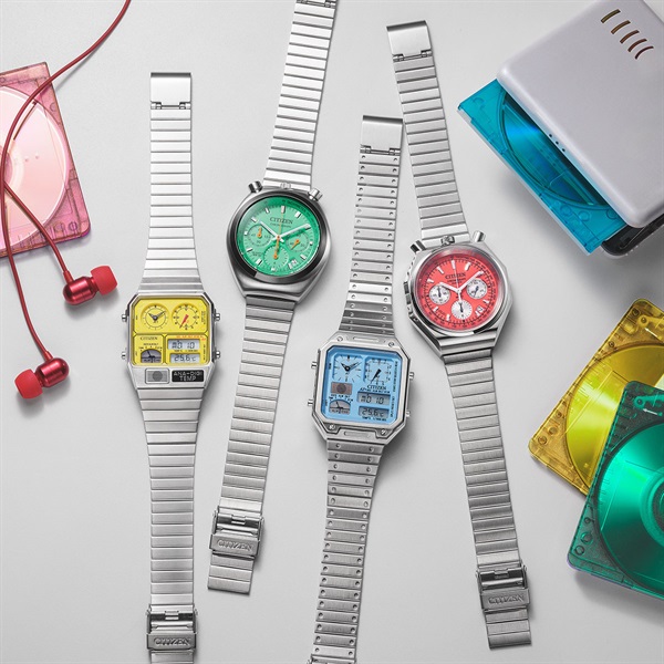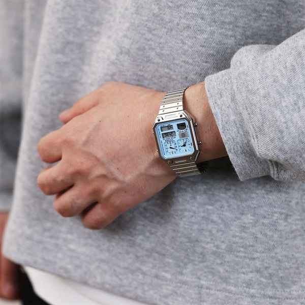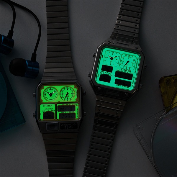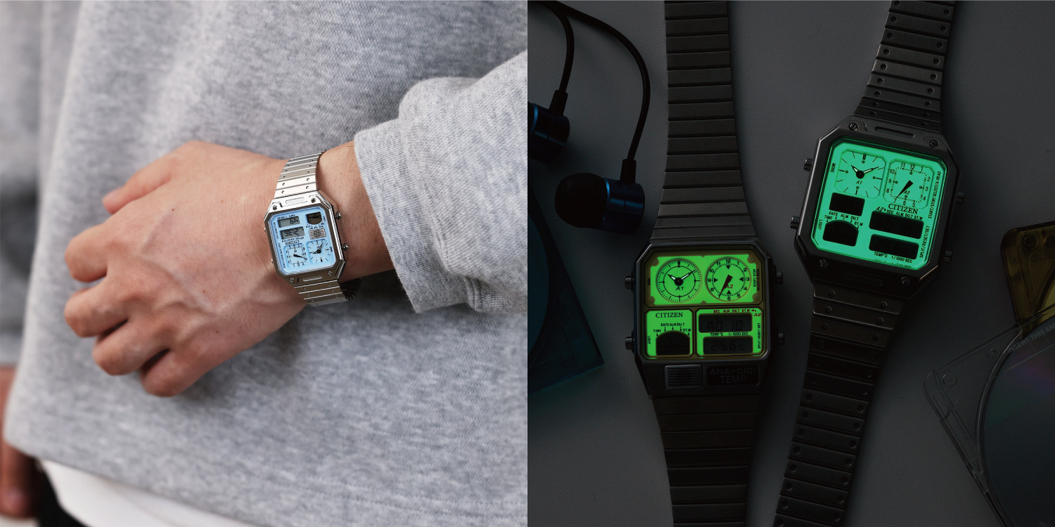レトロな外装と1990年代のプロダクトを思わせる個性的なカラーで、遊び心と懐かしさが同居するデザインです。文字板に夜光塗料を施し、その上にポップなカラーを重ねた特別仕様。光を蓄えると暗闇でも文字板全体がぼんやりと浮かび上がり、視線をキャッチします。限定モデル500本。