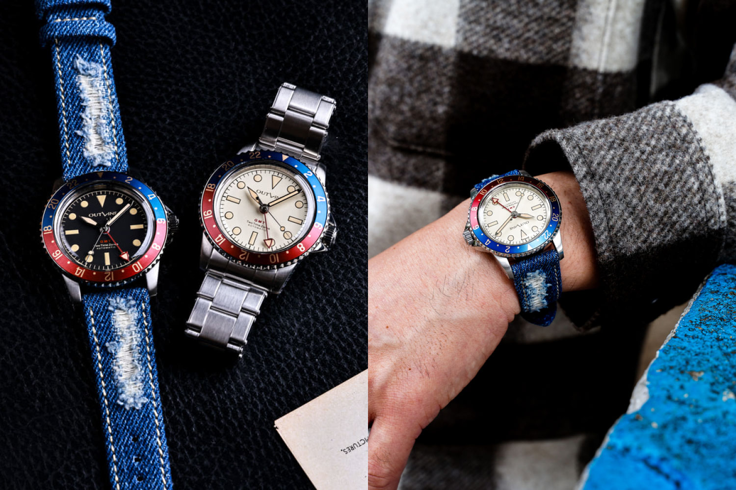 二つの国の時刻を同時に表示できるGMTウオッチの第2弾「GMT-1960」は、1960年代の第2世代をデザインモチーフに、象徴的なペプシベゼルの青と赤の色味について特にこだわりました。ベゼルにはアルミを使用し経年により褪色したかのような古風な色合いと雰囲気を再現しています。こちらはアイボリー文字盤タイプ。
