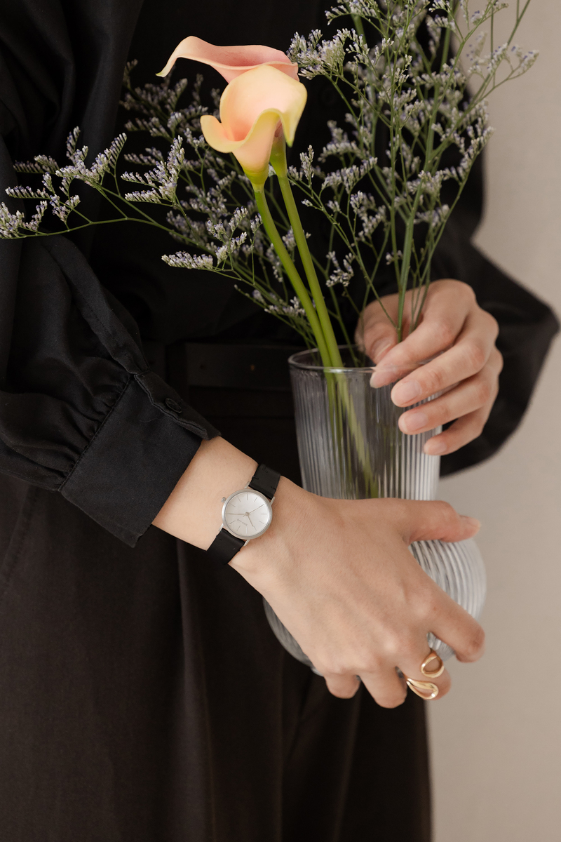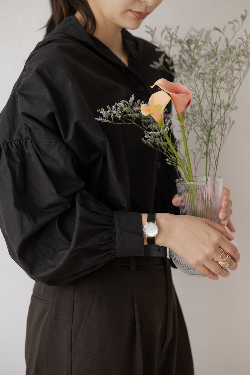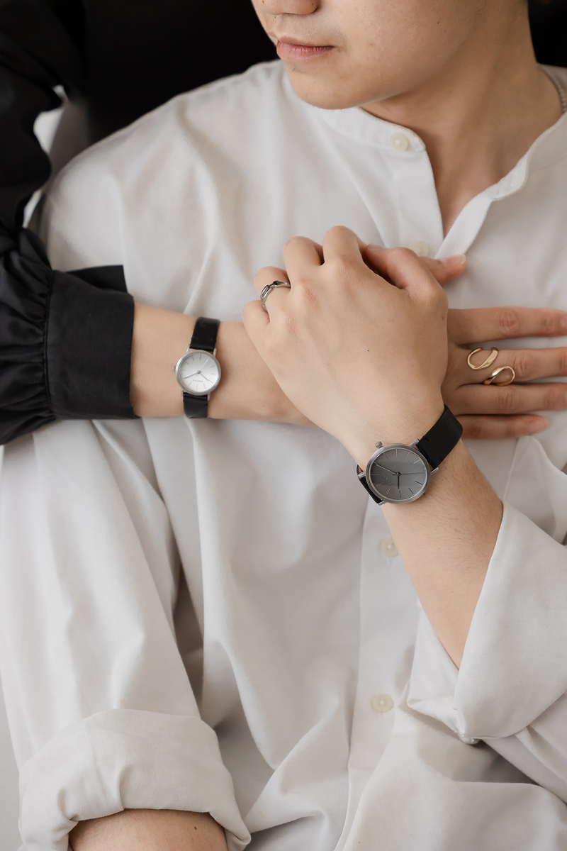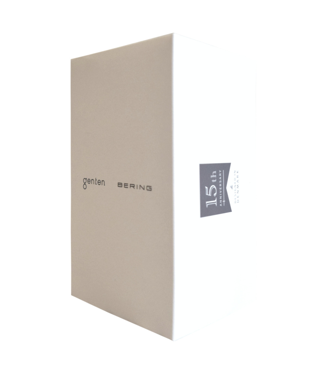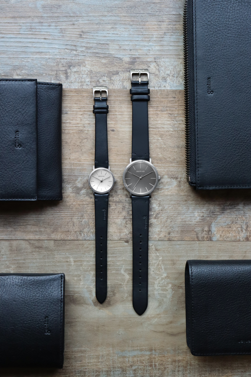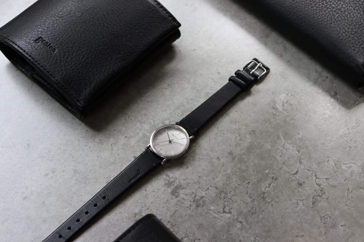 gentenとBERINGが大切にしている考えや想いを、このプロダクトが体現しています。それは、シンプルで目立ちすぎず自然に馴染むデザインであること、長く使い続けることができる素材で、愛着が持てること。このコラボレーションでは、黒のミネルヴァレザーを採用することでより静かに、より凛とした佇まいのプロダクトに仕上がりました。gentenを代表する革ミネルヴァは、使うほどに艶が増し、着用した方それぞれの時間を映すように育っていきます。3針とバーのインデックスで構成されたミニマルなデザインと、傷の付きにくいサファイアガラスはどんなシーンでも安心して身に着けることができます。そして控えめに入れたgentenのロゴや、ストラップの付根に施したステッチ、裏蓋の刻印など、このプロダクトだけの拘りのディティールがふんだんに盛り込まれています。身に着けることで、忙しない毎日の中でふと時間を意識するきっかけになるような、静かな気付きを得られるような、確かな素材で丁寧に仕上げられたプロダクトです。
