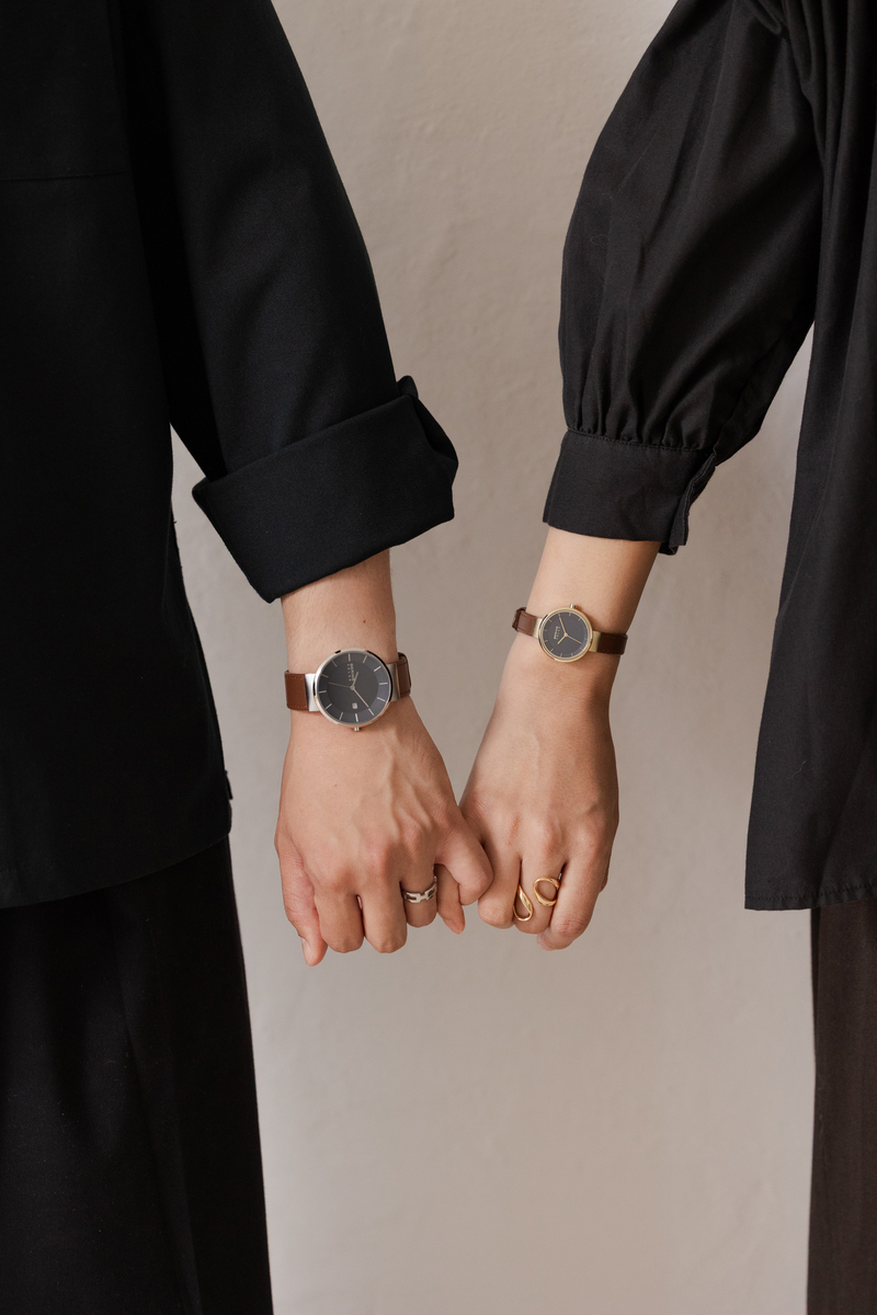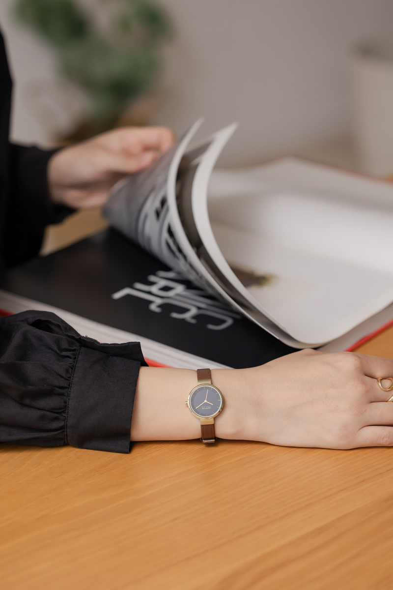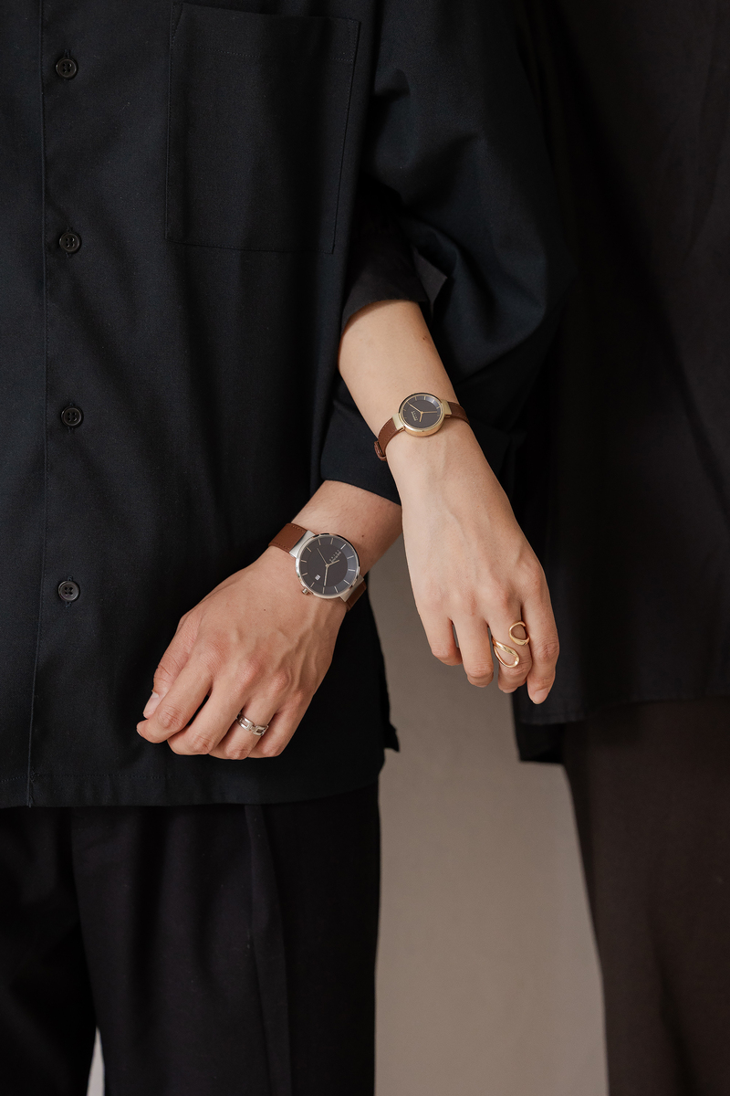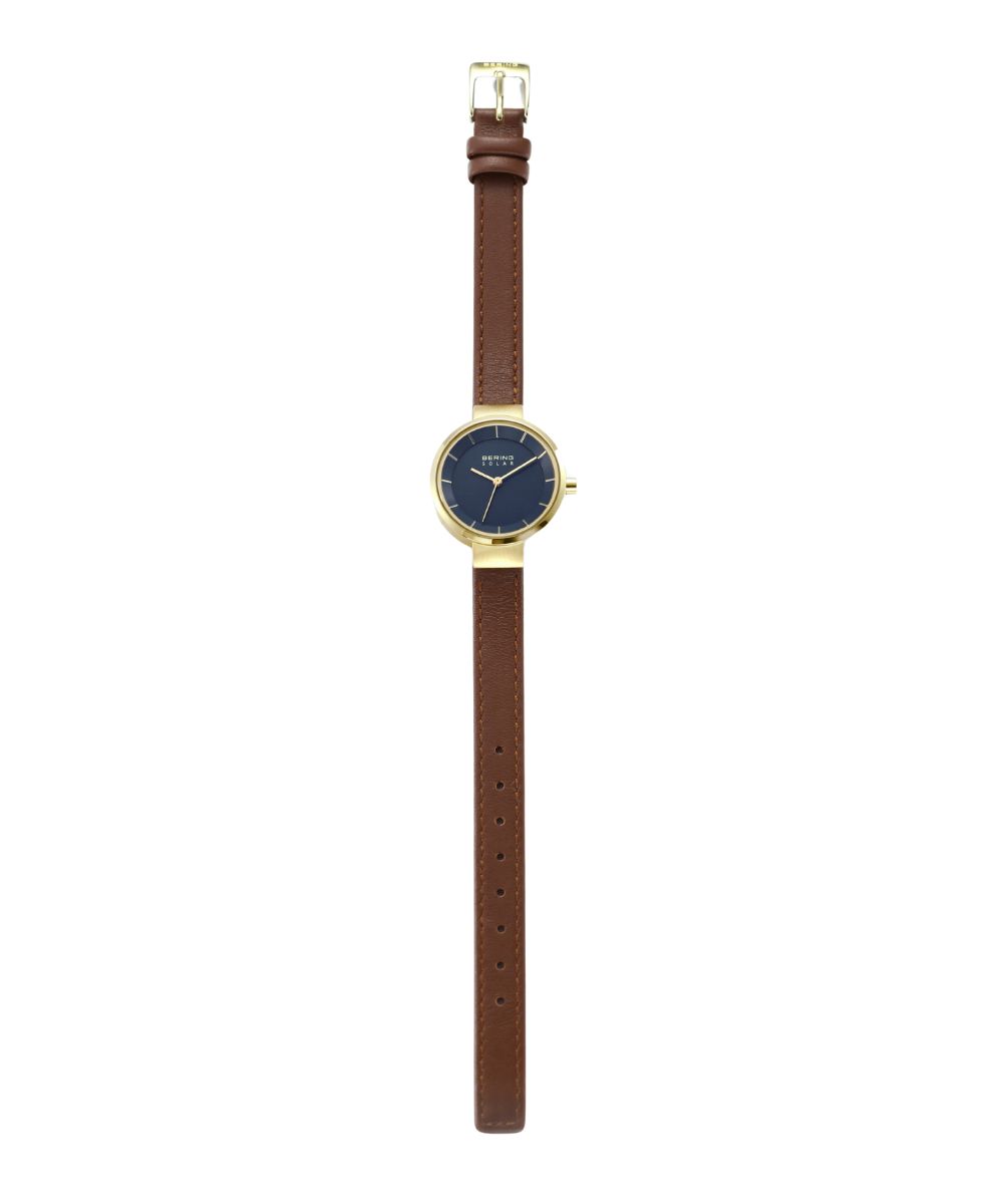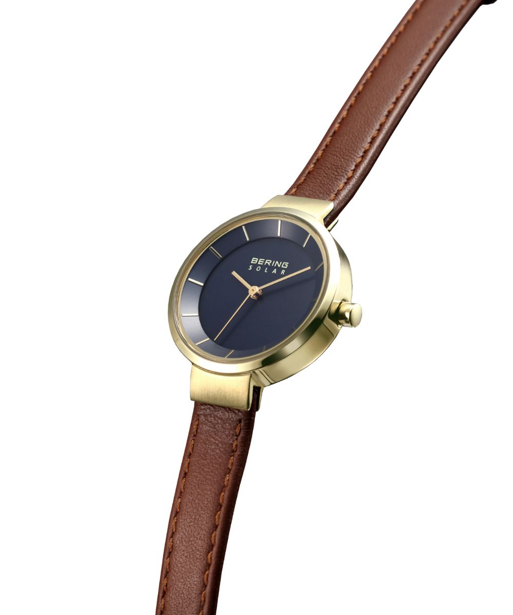BERINGのコレクションの中でも定番で最も人気のあるシリーズ「Scandinavian Solar(スカンジナビアンソーラー)」、ソーラーウォッチはサスティナビリティの観点からも改めて注目されていますが、BERINGのソーラーウォッチは12本のバーと3つの針で構成された北欧ならではのミニマルで洗練されたデザインが特徴です。今回のコレクションでは、上品な輝きを放つシャンパンゴールドのケースに、季節のコーディネートにも合わせやいブラウンのレザーストラップ、そして、ダイヤルは静謐な夜空や、深海を思わせる深いネイビーブルーを採用しました。光沢を抑えた素材の上質さが伝わるネイビーブルーは、カジュアルな装いの差し色としても、スーツやジャケットを羽織るビジネスシーンでも知的で洗練された印象を与えてくれます。