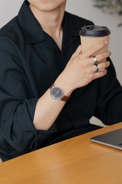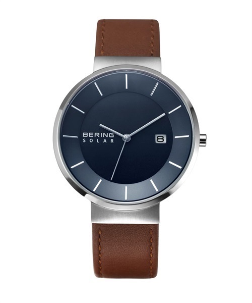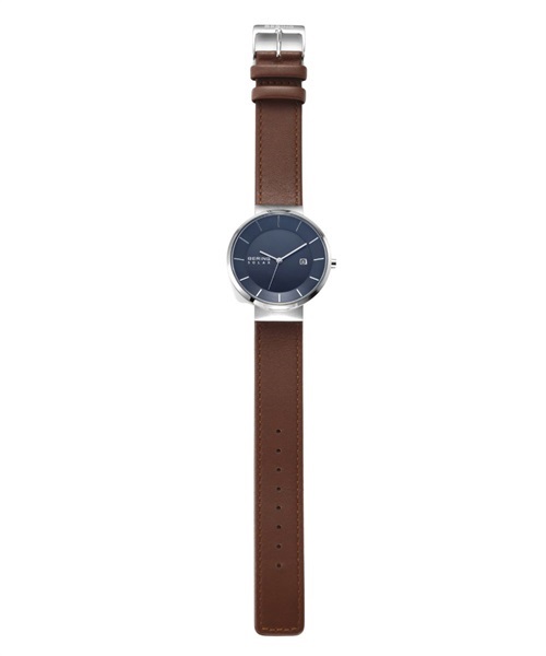 BERINGのコレクションの中でも定番で最も人気のあるシリーズ「Scandinavian Solar(スカンジナビアンソーラー)」、ソーラーウォッチはサスティナビリティの観点からも改めて注目されていますが、BERINGのソーラーウォッチは12本のバーと3つの針で構成された北欧ならではのミニマルで洗練されたデザインが特徴です。今回のコレクションでは、シルバーのケースに、季節のコーディネートにも合わせやいブラウンのレザーストラップ、そして、ダイヤルは静謐な夜空や、深海を思わせる深いネイビーブルーを採用しました。光沢を抑えた素材の上質さが伝わるネイビーブルーは、カジュアルな装いの差し色としても、スーツやジャケットを羽織るビジネスシーンでも知的で洗練された印象を与えてくれます。
