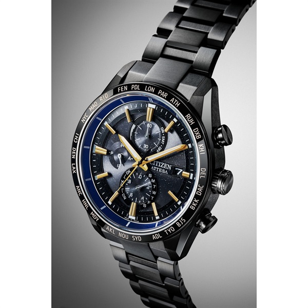 チタニウムで次世代を進み続ける、シチズン ATTESA(アテッサ)。JAXAの新型宇宙ステーション補給機「HTV-X」をイメージした限定モデル。「HTV-X」のボディに着想を得た個性的なカラーリング、ラメのきらめきを生かしたブラックの文字板が宇宙を彷彿とさせます。微細なラメがきらめくブラックの文字板が、宇宙空間を表現。