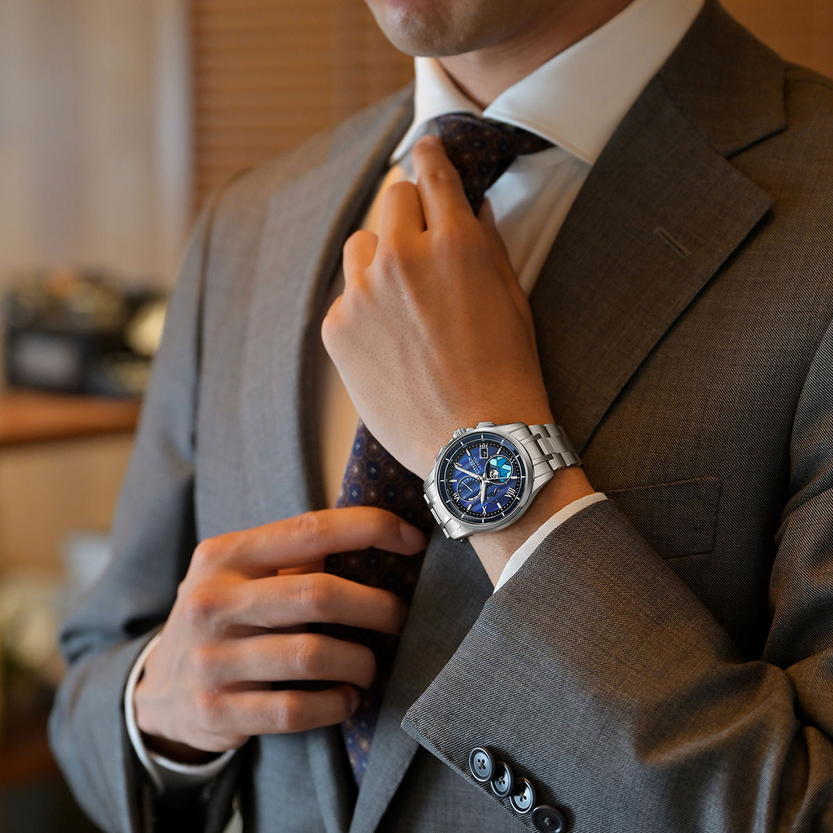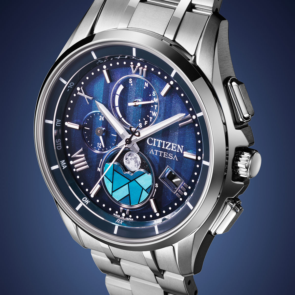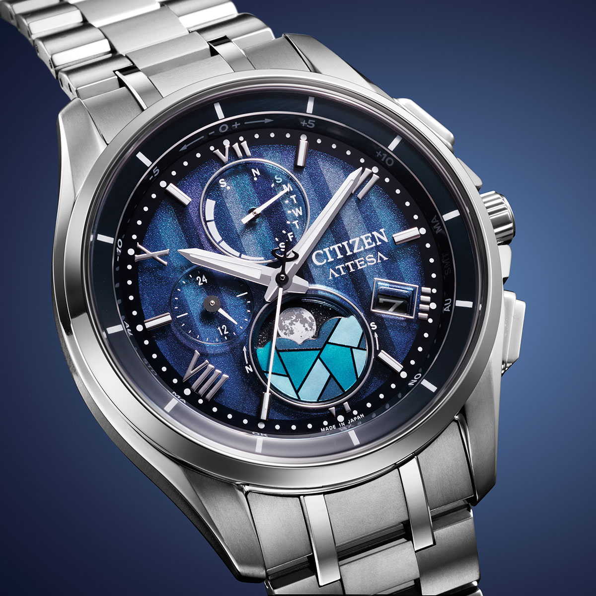 冬の静けさの中にステンドグラスから差し込む光を表現したロマンティックな限定モデルです。月齢自動計算機能「ルナプログラム」搭載モデルを限定仕様にアレンジ。デュラテクトプラチナのケースとバンドが、荘厳で神聖な印象を醸し出します。縦のブルーグラデーションで教会に降り注ぐさまざまな光を描いた文字板に、ローマ数字とバーインデックスを組み合わせたエレガントなデザインです。ムーンフェイズの月齢板を覆うエリアには半透明の印刷を施した白蝶貝を使い、美しく光るステンドグラスを表現。まるでステンドグラス越しの夜空を見上げるように、今宵の月の満ち欠けを確認できます。世界限定2,200本。