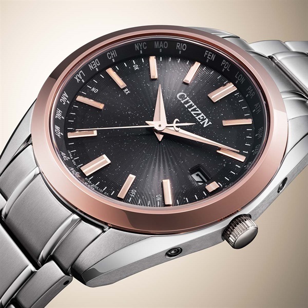 サンレイパターンとゴールドをあしらい、中心からまっすぐと広がっていく光を表現した輝き溢れる限定ならではのデザインです。CITIZEN COLLECTIONでは唯一、ケースとバンドにスーパーチタニウム?を採用した、ベーシックな3針モデルをアレンジ。ピンクゴールドのベゼルを合わせたツートン仕様で、普段使いしやすい色合いの中に華やかさと限定感をプラスしました。インデックスと針はベゼルに合わせたカラー、文字板にはピンクのラメを入れることで、柔らかな輝きと上品な印象を与えます。※裏ぶたの生産国に関する刻印は実際の商品と異なる場合があります。
