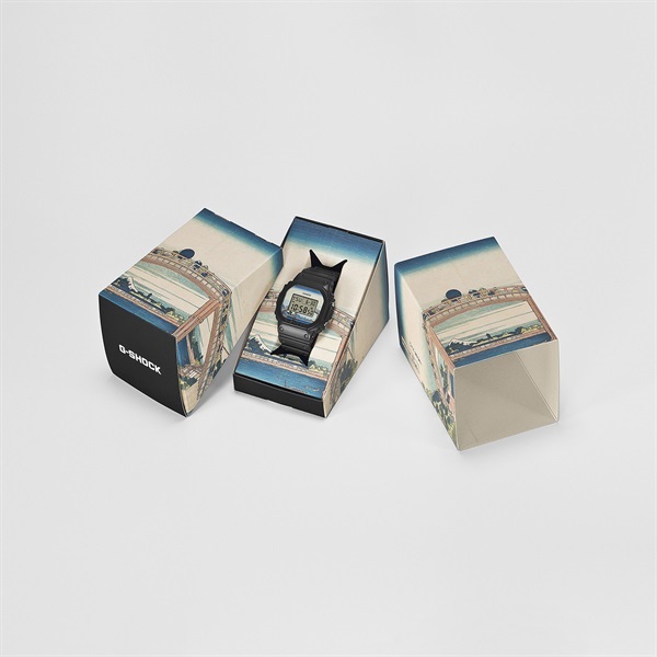 1983年の発売以来、飽くなき強さを求めて進化を続けるタフネスウオッチG-SHOCKから、江戸時代に活躍し国内外で広く知られている浮世絵画家、葛飾北斎の人気作品をデザインモチーフにしたモデルです。北斎の代表作である富嶽三十六景の中から「深川万年橋下」を採用しました。ベースモデルにはアイコニックな定番デジタルDW-5600を採用し、文字板には「深川万年橋下」を大胆にデザイン。LEDバックライト点灯時には文字板と一体となって深川万年橋の曲線美を表現します。裏蓋には漢字で“日本”という文字を刻印しました。また、日本で誕生した浮世絵にちなみ、made in Japanと生産地にもこだわりました。パッケージにもこだわり特別仕様になっています。
