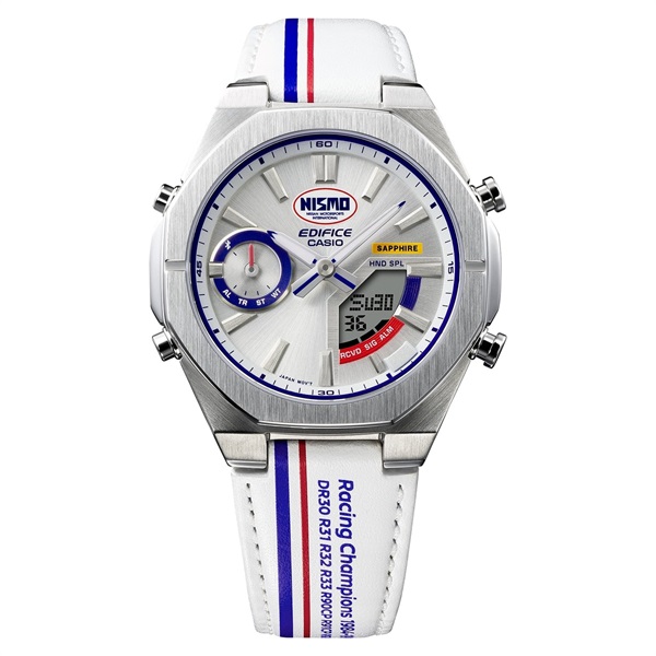 カシオ、日産自動車、NISMOが共同で企画したEDIFICE NISMOヘリテージエディションは、NISMOのレース魂をそのまま腕時計に刻み込んだ特別なモデルです。初代NISMOロゴを採用し、日産ワークスチームのカラーであったトリコロールがダイアルやバンドに映し出されています。バンドの裏側にも青と赤のトリコロールが施され、遊環には初期ユニフォームのストライプを再現。文字板上部の蓄光ロゴは、24時間レースのグループCレース車両の蓄光カーナンバーを思わせます。