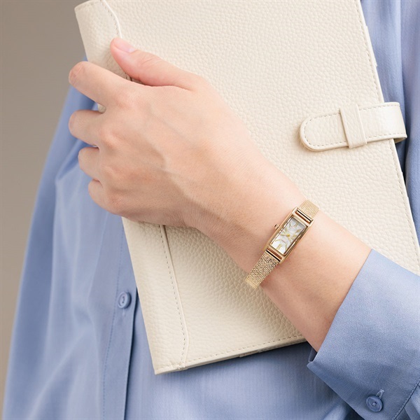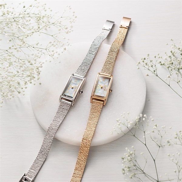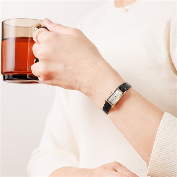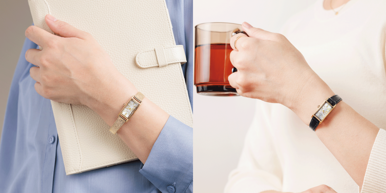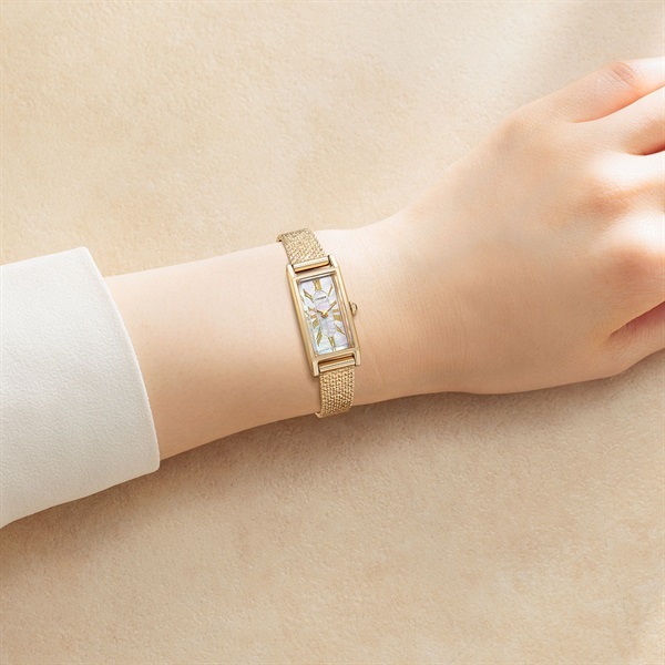 スリムな形状が人気のスクエアケースに、美しい白蝶貝文字板を合わせた限定モデル。文字板中央にギョーシェ彫りを思わせるパターンを施し、高級感と華やかさをきわだたせました。クラシカルな印象のメッシュバンドに、どんなファッションにもマッチするブラックの革バンドをセットした2Way仕様。ご自身で手軽にバンド交換ができるインターチェンジャブル構造を採用しています。世界限定800本。※裏ぶたの生産国に関する刻印は実際の商品と異なる場合があります。