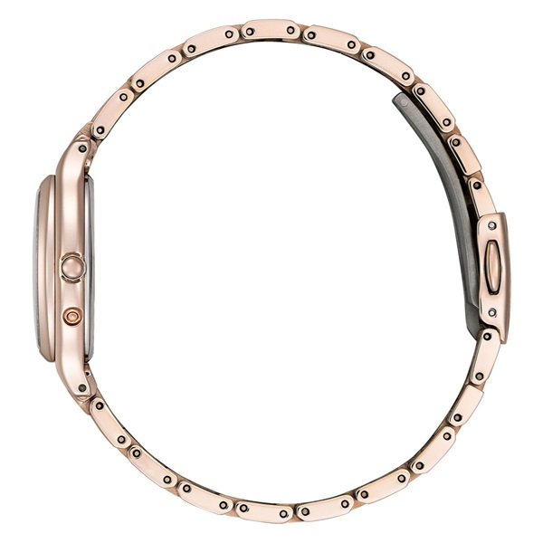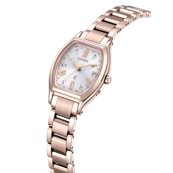 シチズンだけの技術「デュラテクトサクラピンク」が上品な美しさを際立たせます。やわらかな光を感じさせるホワイトの文字板。パールとラメが手元を動かすたびに美しく輝きます。シックで優美なデザインのローマ字フォントを採用。カットパーツと4時と5時の間にあるTYO位置にはきらめく光のアクセントが女性の心をくすぐります。