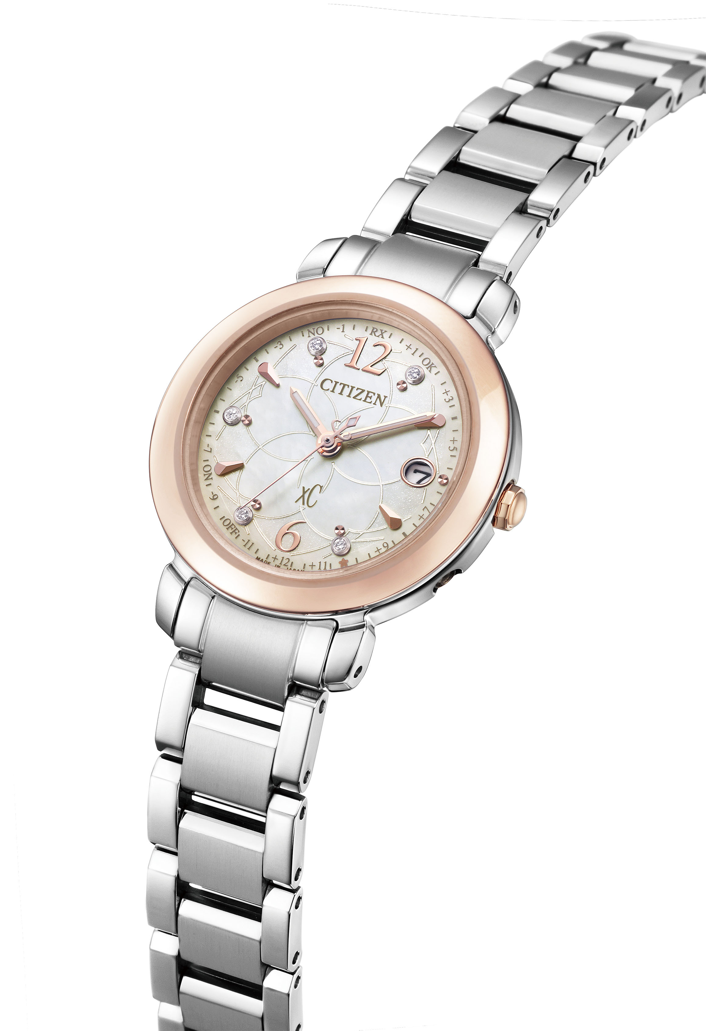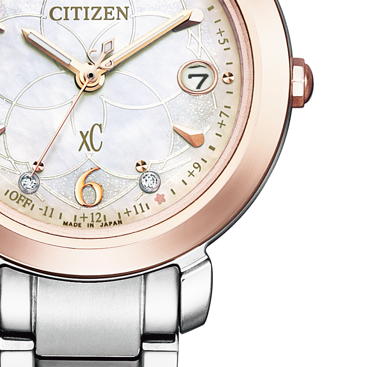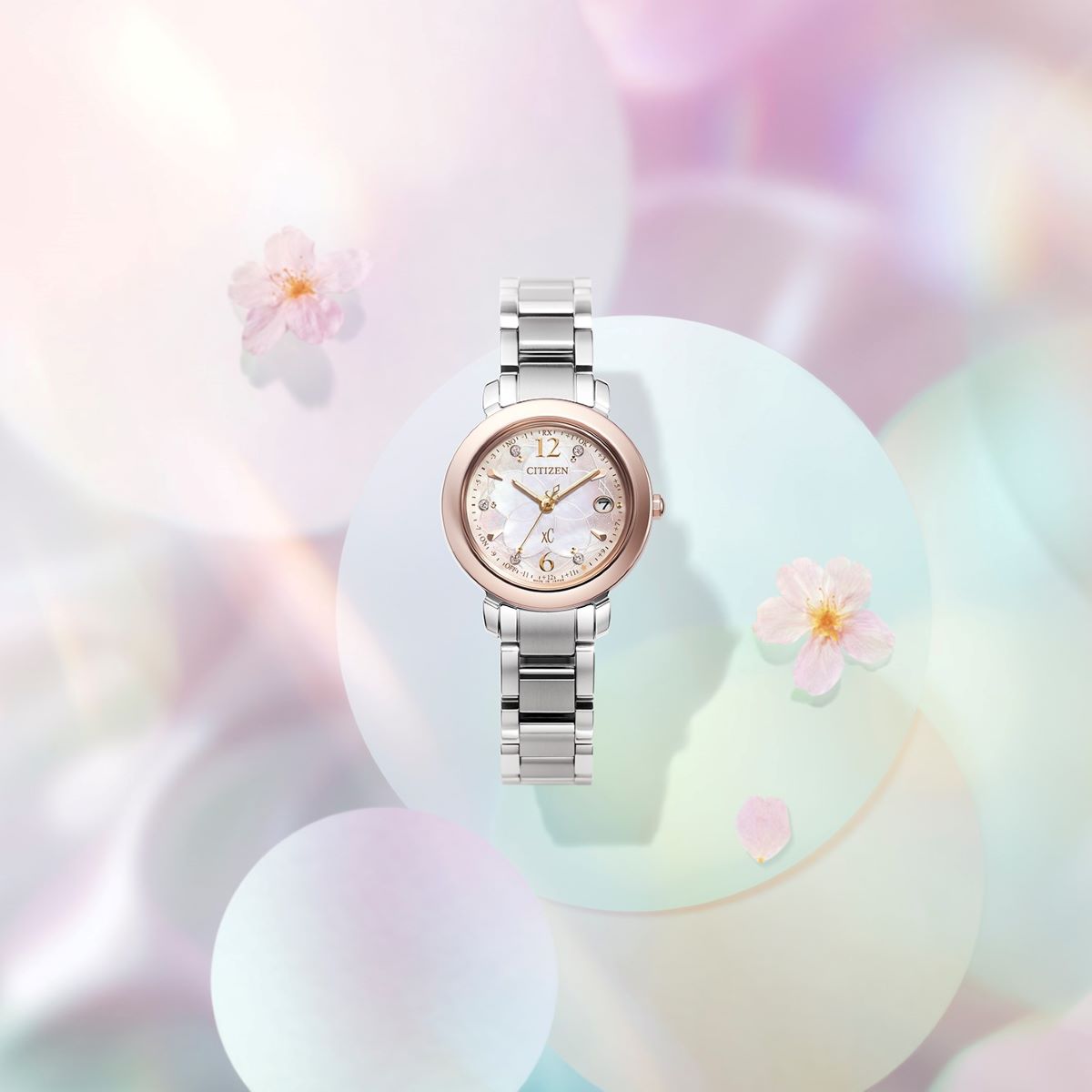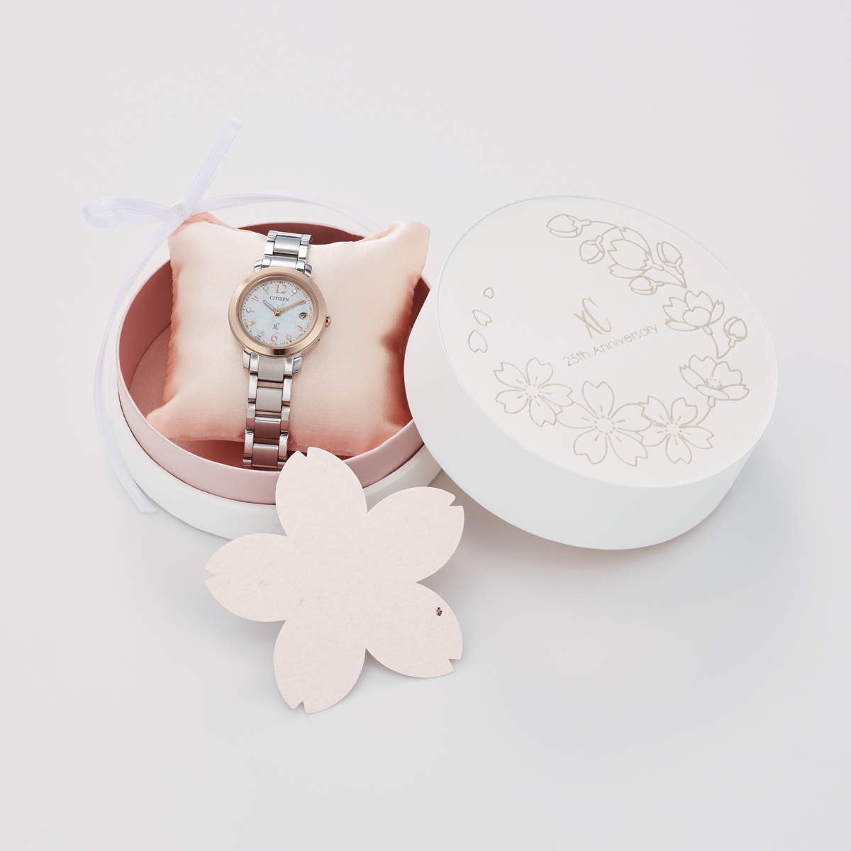 「It's your time to bloom」をデザインテーマに、朝、昼、夜、どんな瞬間もあなたらしい花を咲かせてほしいと想いをこめ、桜をモチーフにデザインした25周年記念限定モデルです。クロスシーの3コレクション「hikari」「mizu」「daichi」のそれぞれから、コレクションのイメージに合わせた時間帯でデザインしました。【hikari】太陽の光が降りそそぐ時間、明るく元気に咲き誇る桜が春の日ざしを受けて輝く様子をグラデーションとラメ、5ポイントのラボグロウン・ダイヤモンドで表現。アラビア数字のインデックスが凛とした表情をプラスしています。ブランド誕生25周年を記念し、25分の位置に桜の花のワンポイントを添えています。美しいダイヤルデザインが上品で華やかな印象の1本です。シルバー色のベルトで、ビジネス使いもしやすいデザインです。限定BOXには、あなたらしい花を咲かせて欲しいと願って、シードペーパーのメッセージカードが付いています。
