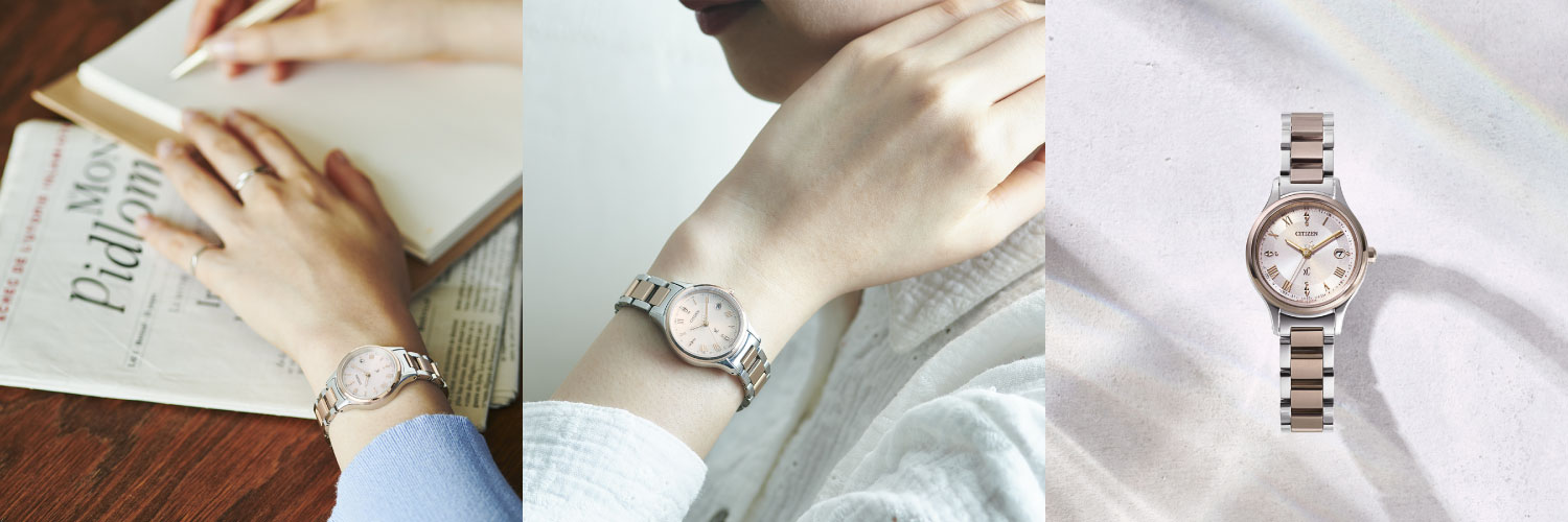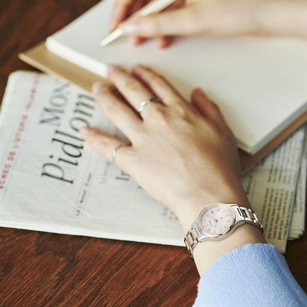 上品で洗練されたデザインが美しい腕元を演出します。hikariコレクションの特徴である艶やかなベゼルを、すっきり細くアップデート。クロスシーのデザインポイントのひとつであるミルグレインリング。持ち主の幸せを願い、お守りとなるよう想いを込めた“光の粒”を、ガラスにレーザー加工で表現しました。