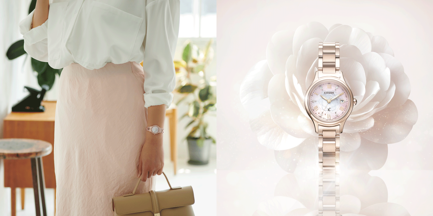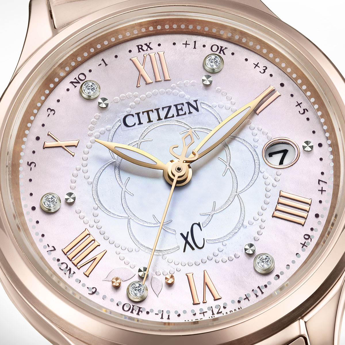 満開の美しいカメリア(椿)をモチーフにデザインした白蝶貝の文字板には、エッチングの花模様と“光の粒”が花びらに乗っているかのようなドットパターンを組み合わせ、愛らしさを表現しています。世界限定1,300本。