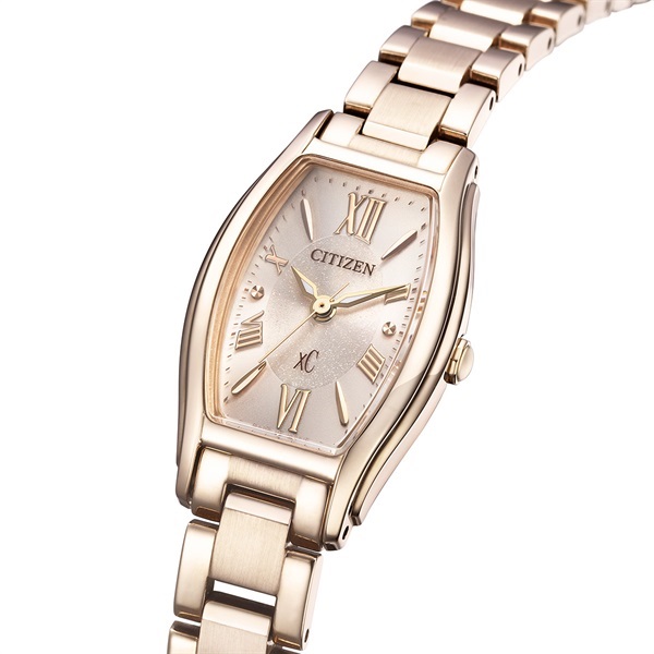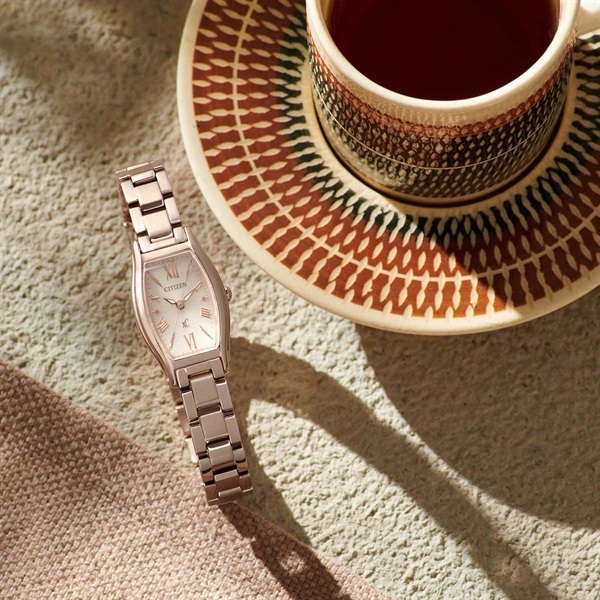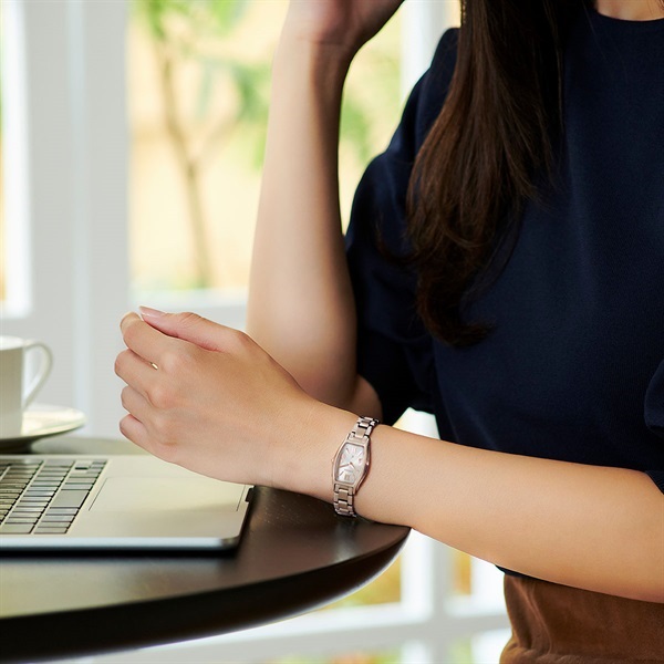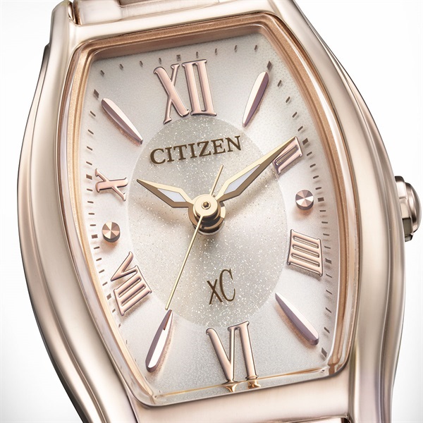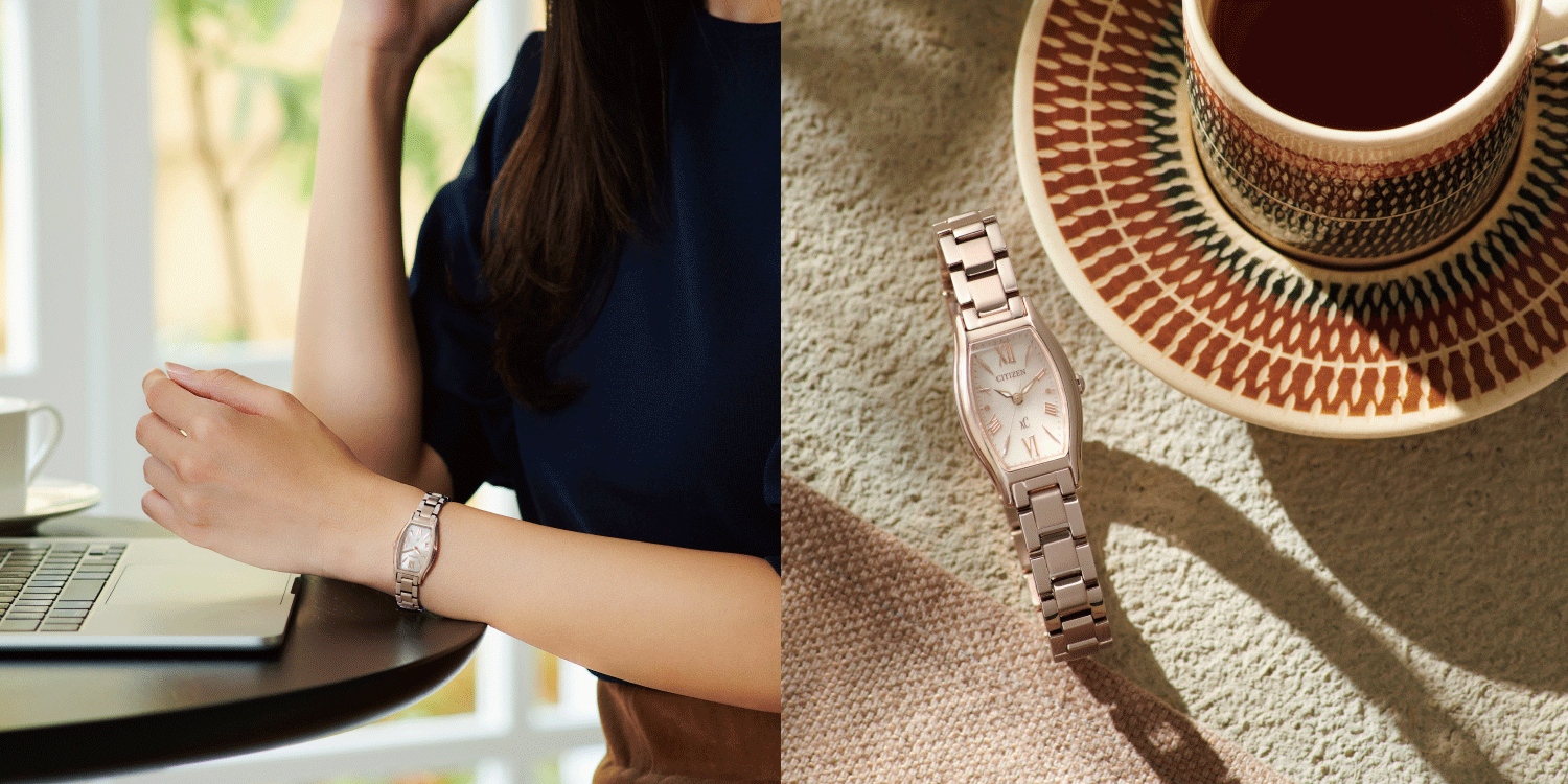 華やかなサクラカラーを纏った女性の腕元を知的に飾るエコ・ドライブモデルです。文字板には、サクラカラーのケースと調和するベージュカラーを選び、中央にはラメを施してさりげない艶感をプラス。控えめながらも上品な輝きが楽しめます。また、細長いリーフ形状の植字と軽やかなローマ数字のインデックスが、シンプルながらもクロスシーらしい個性を感じさせるデザインです。毎日使いたくなる、飽きのこない魅力的な一本です。