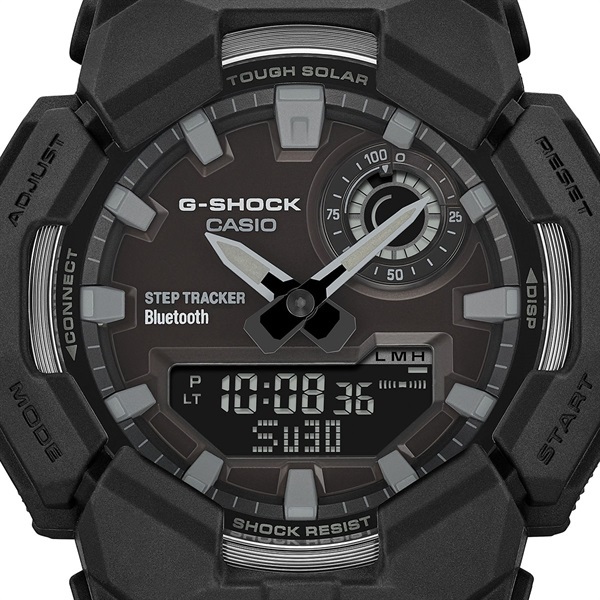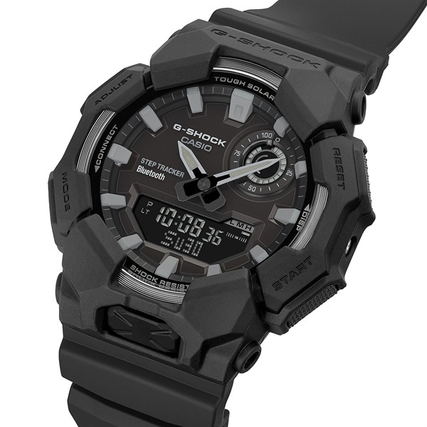 1983年の発売以来、飽くなき強さを求めて進化を続けるタフネスウオッチG-SHOCKから、ソーラー発電のみでライフログを計測できる、Bluetooth通信機能搭載のビッグケースモデルです。見やすい大型液晶のアナログ・デジタルコンビネーションモデル。リングベゼルには蒸着処理を施し、また、旭光仕上げのダイアルとメタリックインダイアルリングなどバリューのあるデザインになっています。消費電力を抑えるため、新開発のLSIと独自アルゴリズムを採用した新モジュールを開発しました。従来モデルと比較し、歩数計測の消費電力を約40%削減。ソーラー発電のみで充電し、歩数を計測・表示します。機能面ではBluetooth通信機能を搭載。専用アプリCASIO WATCHESとの連携により、正確な時刻情報を取得します。あわせて、ワールドタイム、ストップウオッチといった基本性能を備えています。大型フロントボタンで操作しやすい高輝度なフルオートダブルLEDライトや、インデックスと針の蓄光により、暗闇での視認性も確保しています。カジュアルスタイルからワークスタイルまで合わせやすく、長く愛用できるアイテムです。* ケース、ベゼル、バンドの主な樹脂パーツにバイオマスプラスチックを使用。原料に再生可能な有機資源を使用し、環境負荷低減への貢献が期待されています。