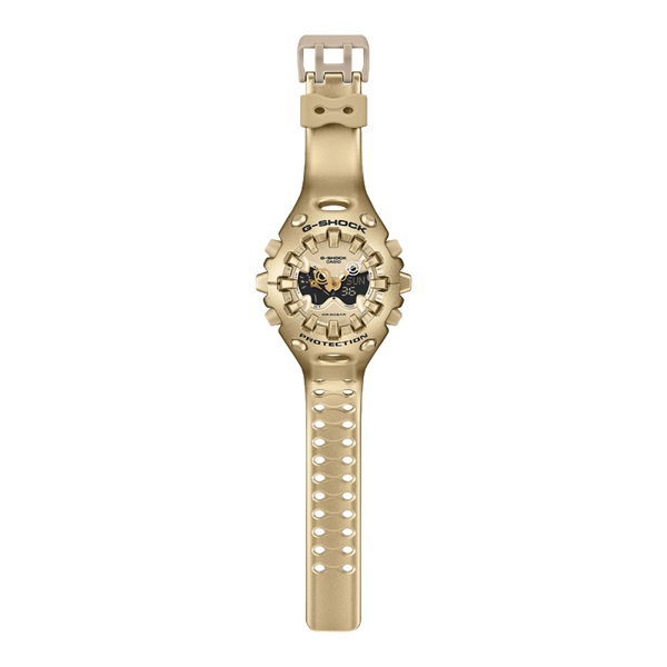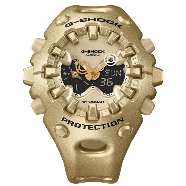 タフネスを追求し進化を続けるG-SHOCKから、エッジの効いたパーツを組み合わせたフォルム、大型全面液晶、ショックリリース針など斬新な発想でG-SHOCKのアイデンティティである「強さ」を形にしたモデルです。モジュールを保護するセンターケースをベゼル・バンド一体構造の外装パーツでカバー。大型の立体インデックスをガラス上面に配することで、衝撃を緩和するバンパーの役割も果たしています。また、衝撃の影響を受けやすい針を磁石の力で取り付けるマグネティックホールディング構造を開発。磁力で固定されているため受けた衝撃を受け流すことができます。フェイスにはオープンワーク(透かしの部分を作る技法)を施したダイアルとフルスクリーンLCDのレイヤー構造を採用。実用的な機能を搭載しながら約10年の電池寿命を実現しています。