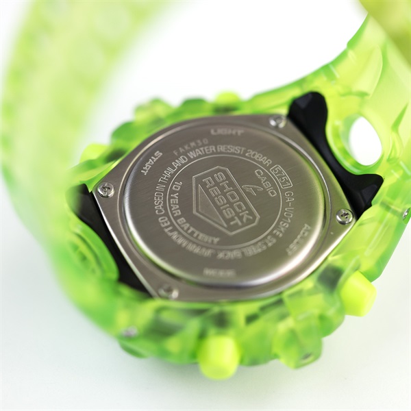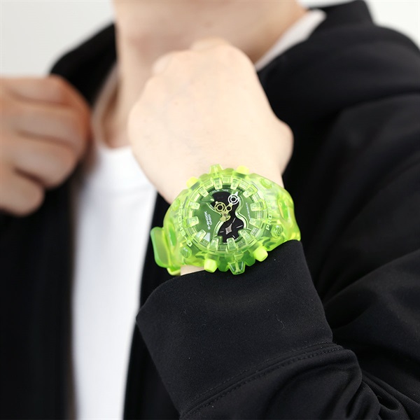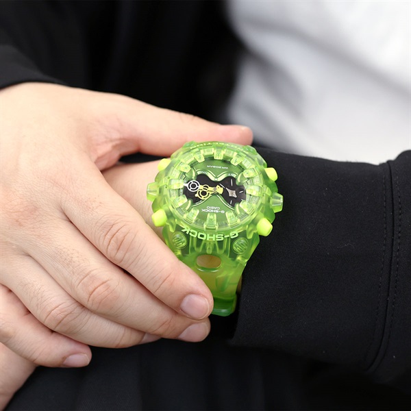 タフネスを追求し進化を続けるG-SHOCKの構造とデザインにこだわったGA-V01シリーズから、Y2K時代のテック製品にインスピレーションを得たデザインを採用したTRANSPARENT PACKのご紹介です。エッジの効いたパーツを組み合わせた有機的な外装フォルムや、大型の全面液晶、ショックリリース針など、今までの常識を覆す斬新な発想で、G-SHOCKのアイデンティティである「強さ」を形にしています。モジュールを保護するセンターケースは、ベゼルとバンドが一体となった外装パーツでカバーされています。大型の立体インデックスをガラス上面に配置することで、衝撃を緩和するバンパーの役割も果たしています。これにより、G-SHOCK独自の耐衝撃性能を維持しつつ、ユニークで力強い外装デザインを実現しました。アナログ・デジタルコンビネーションタイプのフェイスには、オープンワーク(透かしの部分を作る技法)を施したダイアルとフルスクリーンLCDのレイヤー構造を採用しています。センターには異形タイプの時分針、液晶内には小針を配置し、斬新なデザインに仕上げています。