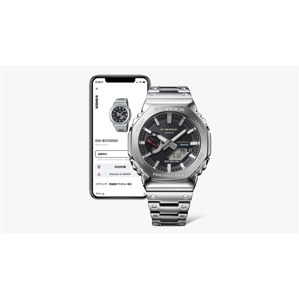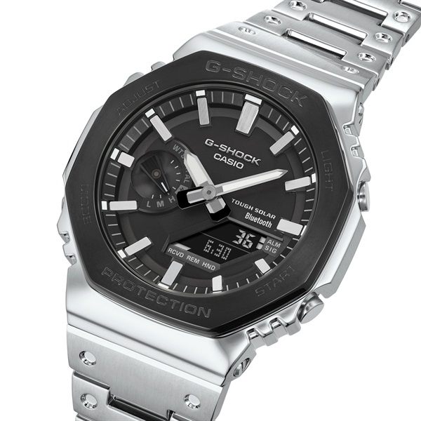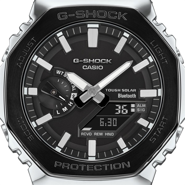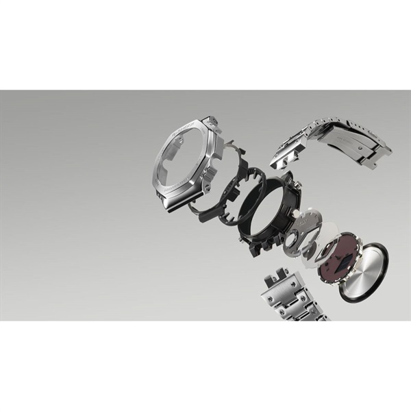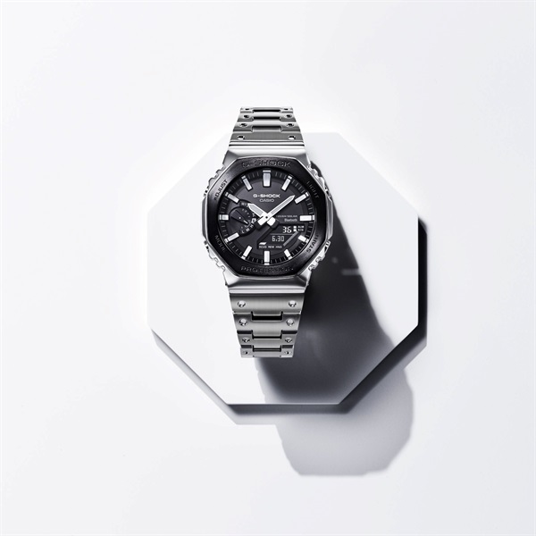 G-SHOCK初代モデル“DW-5000C”の八角形フォルムを受け継ぐGMW-B5000・GM-B2100・GMC-B2100から、その象徴的な八角形トップベゼルにブラックを採用したモデルです。シルバーの中に際立つブラックがG-SHOCKの象徴的な強さを強調しつつ、幅広いスタイルに合わせやすいモノトーンデザインとなっています。GM-B2100BTはトップベゼルにヘアライン仕上げを採用し、落ち着いたメタル感を演出。さらに、視認性を高めるためインデックスにはシルバー蒸着を施し、ダイアルとのコントラストを際立たせています。ステンレススチール製のベゼルは、鍛造・切削・研磨といった手間のかかる加工を経て立体的に成形し、美しく仕上げています。フルメタルによる耐衝撃構造を実現するため、ベゼルとケースの間にはファインレジン性の緩衝材を実装。また、メタル製のバンドピースにはディンプル加工を施し、G-SHOCK 初号機の樹脂バンドデザインを継承しています。製造は初代G-SHOCKを生み出したマザーファクトリー「山形カシオ」で行われています。さらにステンレススチール製ケースは、気密性に優れたスクリューバックケースを採用しています。
