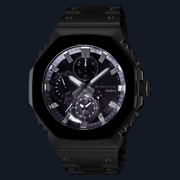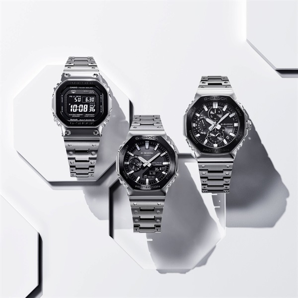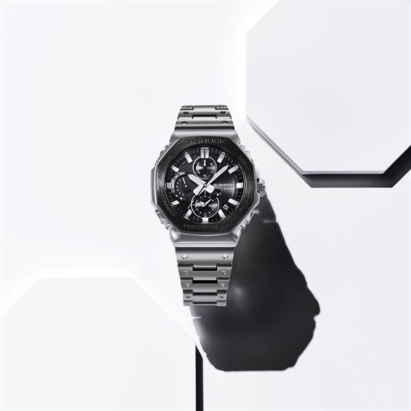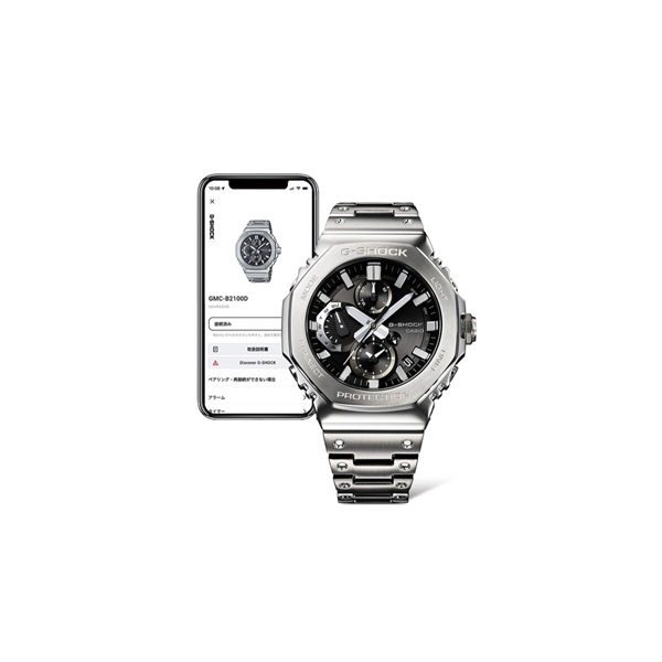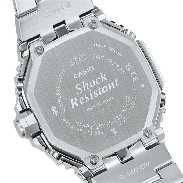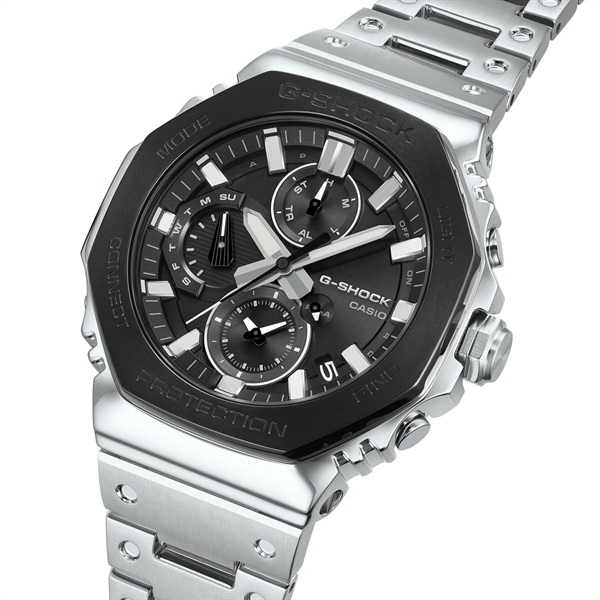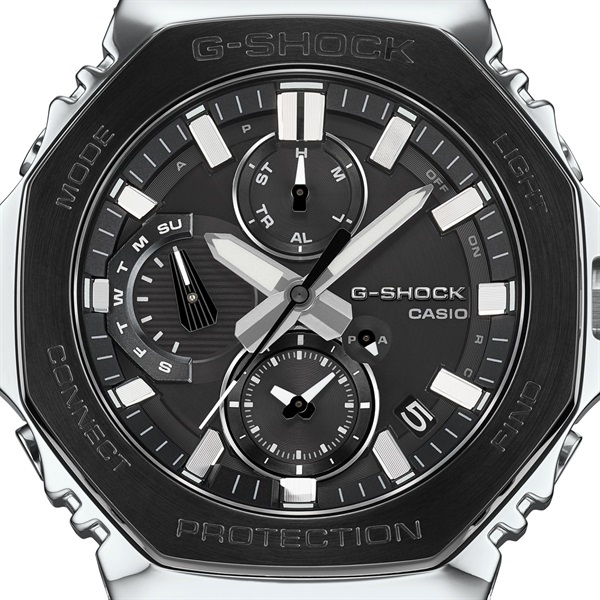 G-SHOCK初代モデル“DW-5000C”の八角形フォルムを受け継ぐGMW-B5000・GM-B2100・GMC-B2100から、その象徴的な八角形トップベゼルにブラックを採用したモデルです。シルバーの中に際立つブラックがG-SHOCKの象徴的な強さを強調しつつ、幅広いスタイルに合わせやすいモノトーンデザインとなっています。GMC-B2100BTはトップベゼルにヘアライン仕上げを採用し、落ち着いたメタル感を演出。さらに、視認性を高めるためインデックスにはシルバー蒸着を施し、ダイアルとのコントラストを際立たせています。ステンレススチール製のベゼルは、鍛造・切削・研磨といった手間のかかる加工を経て立体的に成形し、美しく仕上げています。フルメタルによる耐衝撃構造を実現するため、ベゼルとケースの間にはファインレジン性の緩衝材を実装。また、メタル製のバンドピースにはディンプル加工を施し、G-SHOCK 初号機の樹脂バンドデザインを継承しています。製造は初代G-SHOCKを生み出したマザーファクトリー「山形カシオ」で行われています。