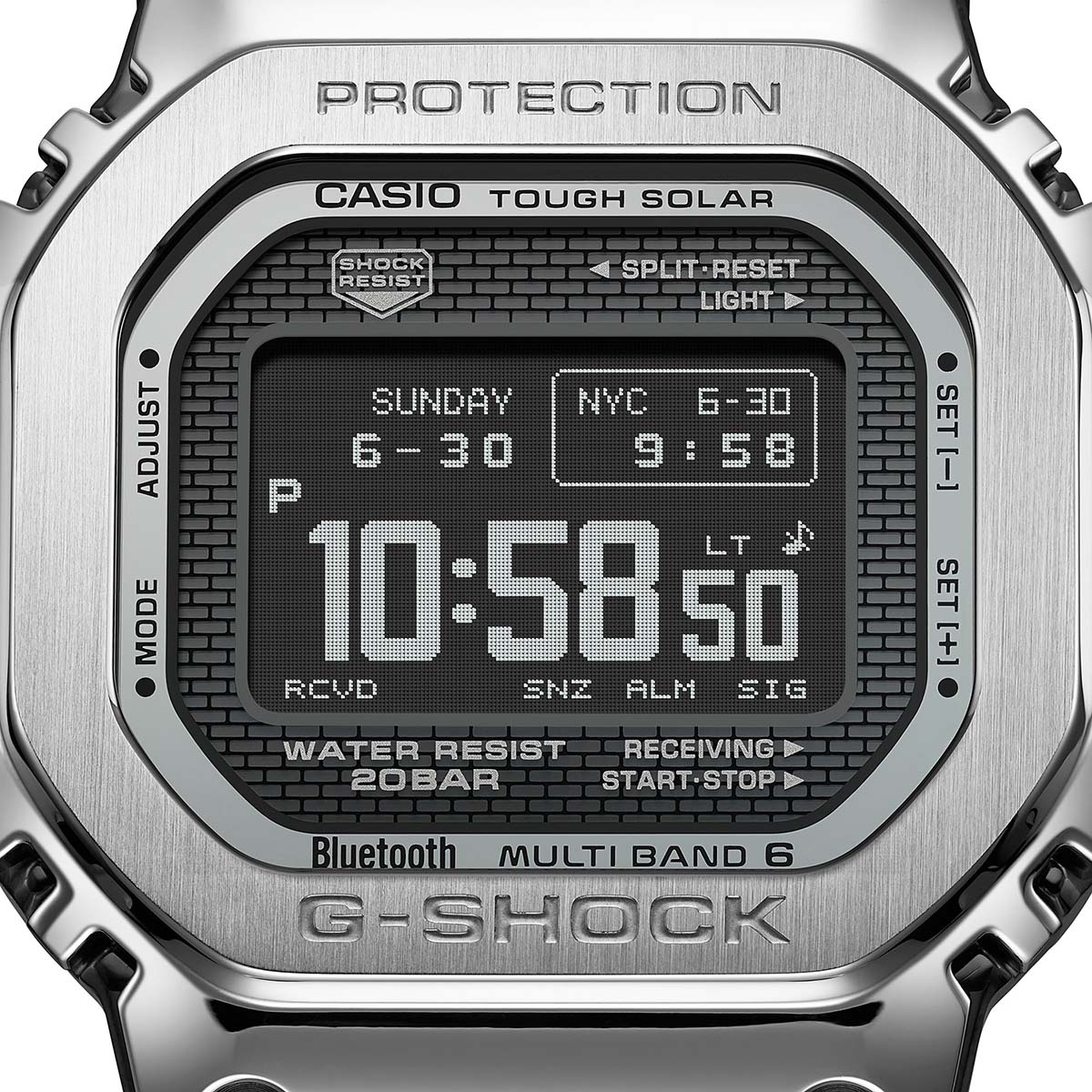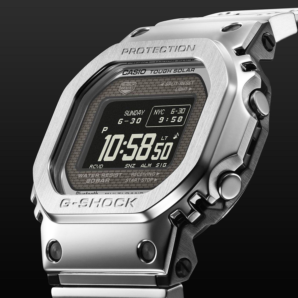 初代G-SHOCK“DW-5000C”のデザインを受け継ぎ、機能と素材の両面で独自の進化を続けてきた5000シリーズ。GMW-BZ5000は、40年以上にわたり蓄積されたG-SHOCKの耐衝撃構造データをもとに、人とAIが共創したジェネレーティブデザインを構造および外装設計に新たに採用したモデルです。初代G-SHOCKから続く角型フォルムはそのままに、ベゼルでセンターケースをフルカバーする従来構造を、新たな設計手法でリファイン。ベゼルとセンターケースを上下で連結した構造を新たに開発しました。ケースサイドから見える複雑で未来的な造形が、構造の美しさを強調しています。弾性変形で衝撃を吸収する樹脂製のインナープロテクターを内部に実装し、フルメタルながらもG-SHOCKの耐衝撃基準をクリア。ステンレススチール製ケースは、気密性に優れたスクリューバックケースを採用しています。また、デジタル表示部に、高精細・広視野角・高コントラストのMIP(メモリインピクセル)液晶を採用。従来の液晶に比べ、よりきめ細かい描画を可能とし、明るい屋外や直射日光下でも優れた視認性を誇ります。ソーラー発電のみでの駆動を実現するため、新たにMIP 液晶を開発しました。画面を構成する「画素」の中にメモリを持つ高精細なフルドットディスプレイにより、4種類の基本時計表示をボタン操作で切り替えられます。また、アプリと連携させることで、メイン表示をクラシカルな7セグメントフォントに切り替えることが可能です。時刻表示画面レイアウトは、初代G-SHOCKのイメージを継承し、先進の機能と伝統的なスタイルとの融合を図りました。機能面ではBluetooth通信機能により専用アプリ「CASIO WATCHES」と接続し時刻情報を取得。マルチバンド6やタフソーラー等、実用的な機能を備えています。製造は、初代G-SHOCKを生み出したマザーファクトリー「山形カシオ」で行われています。