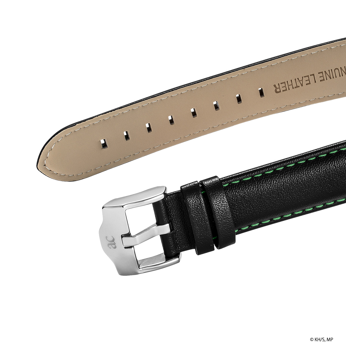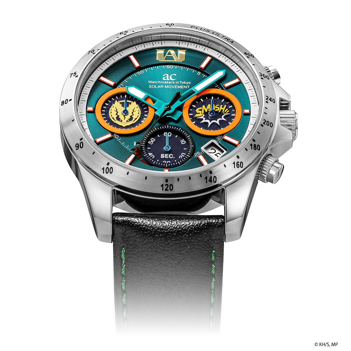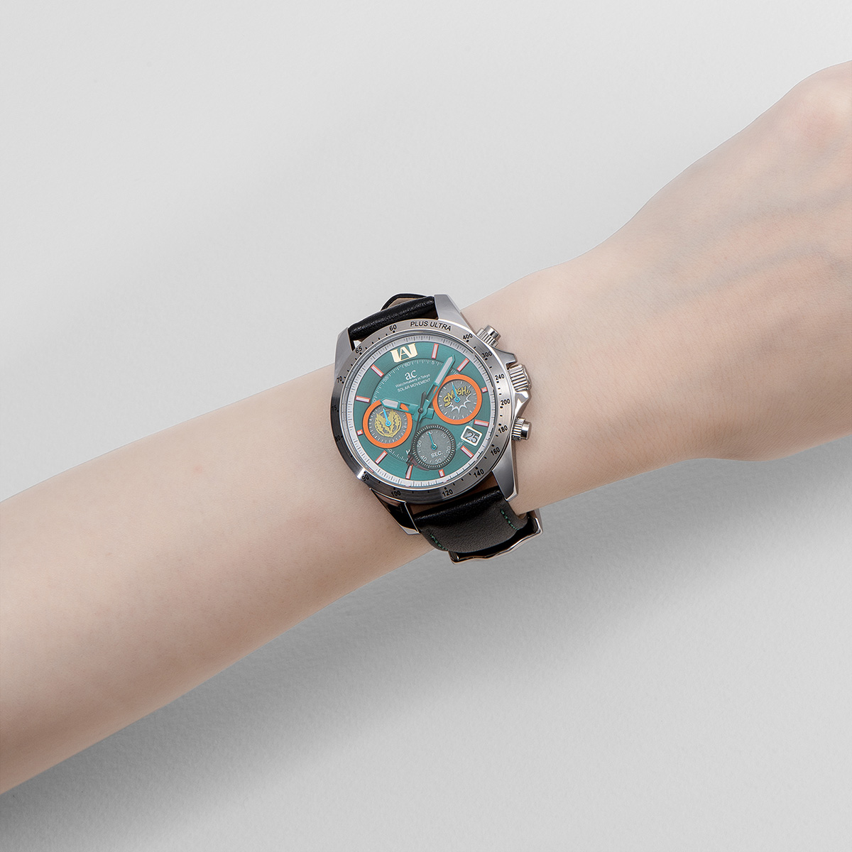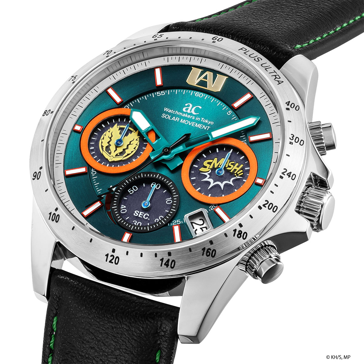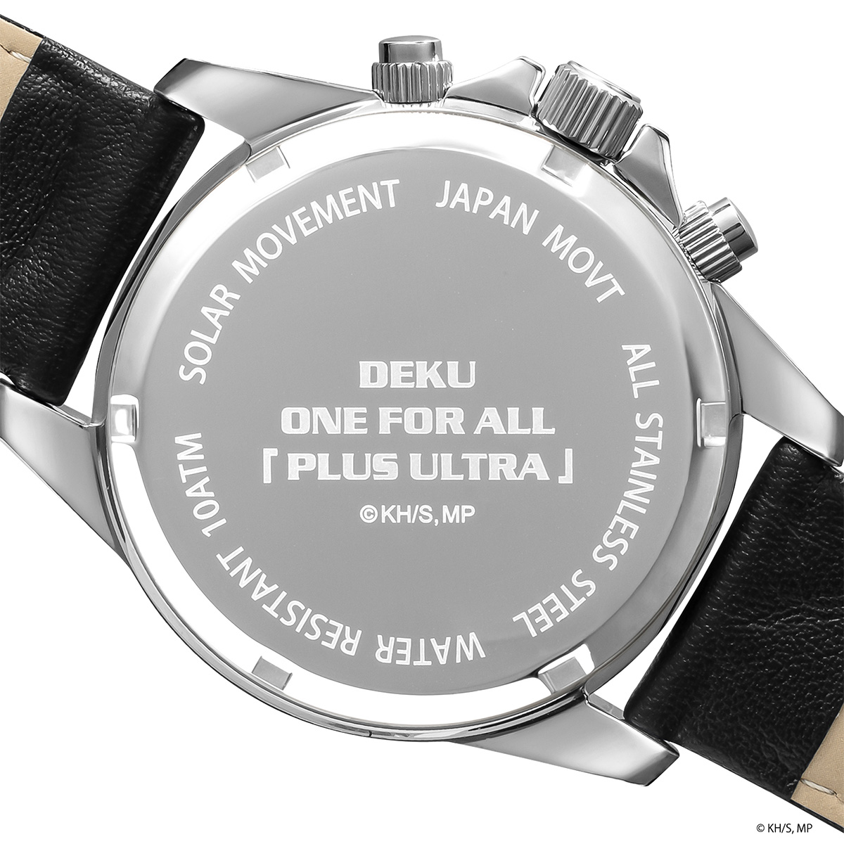 デクらしさを感じさせるグリーンを基調にデザイン。サブダイヤルには「黒デク」をモチーフとしたアイコンと、「SMASH!!」を力強い爆発エフェクトでデザイン。デクの軌跡、成長、そして「ワン・フォー・オール」の継承者としての覚悟を見事に表現した1本に。※裏蓋のロゴ位置がずれている場合がございますが、時計構造上による商品仕様となりますこと、予めご了承ください。