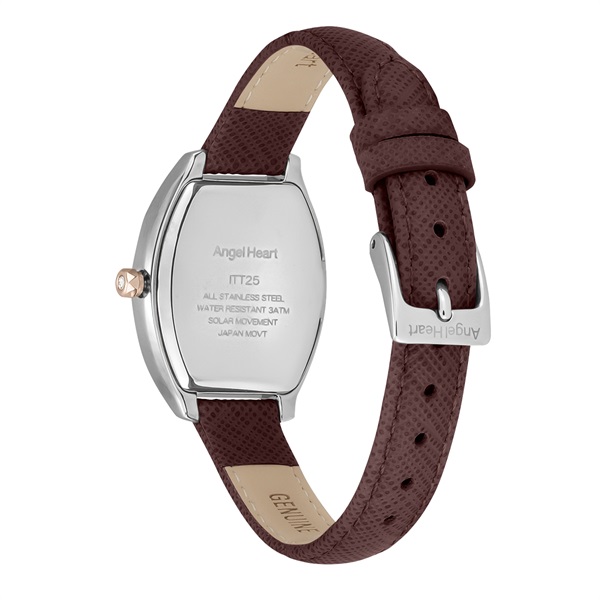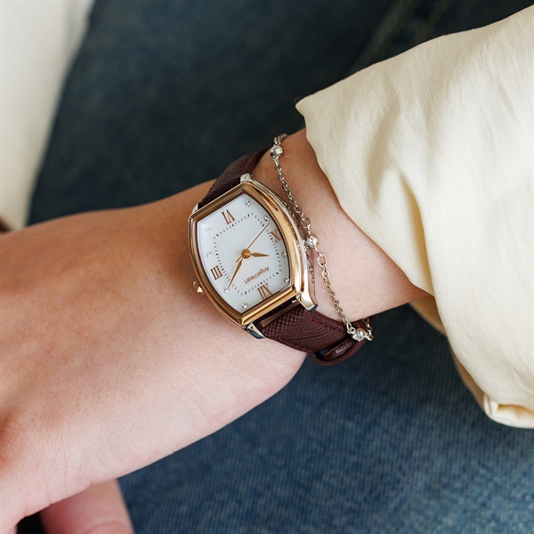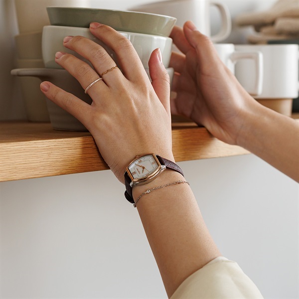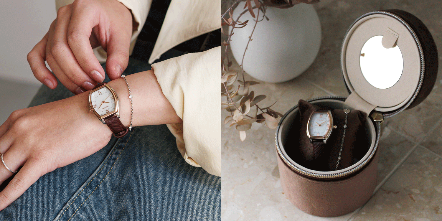 エレガントなトノー型が叶える洗練されたスタイルの『Innocent Time』シリーズより別注カラーが登場。どんなシーンにも使いやすいプレシャスゴールド(ピンクゴールド)×シルバーの絶妙なカラーバランスがとれたコンビモデルにブラウンのサフィアーノレザーを合わせました。安心の「日本製ソーラームーブメント」を搭載しており、太陽光や室内の光で充電し、6ヶ月駆動します。*「橋本環奈」さんオリジナルデザインのQUOカード付き。