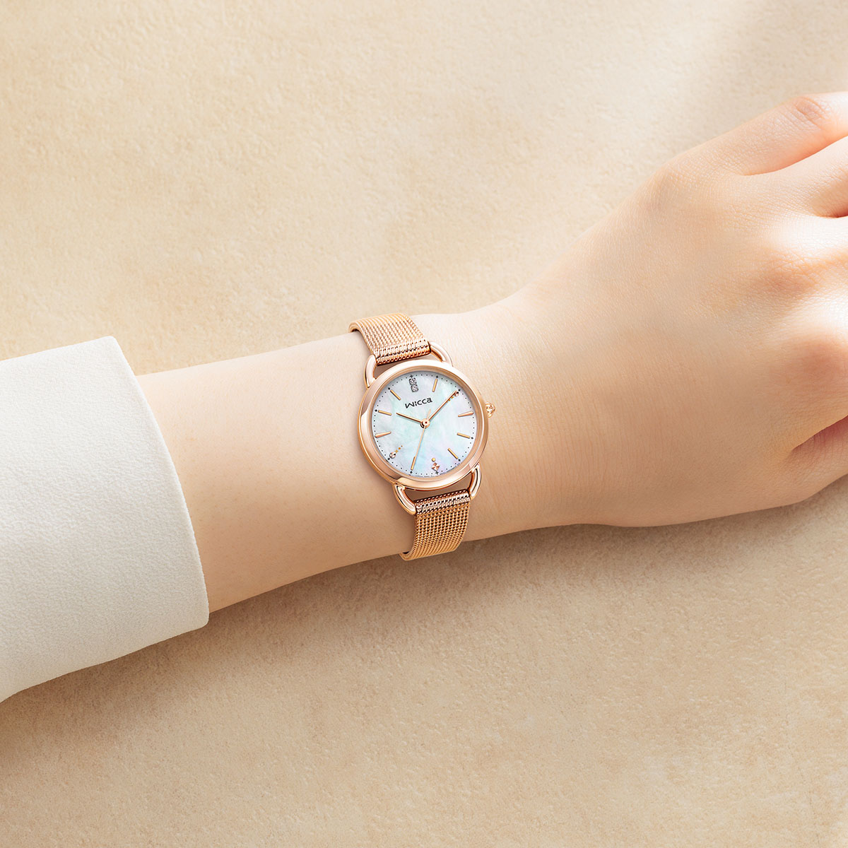 白蝶貝文字板にシンプルなバーインデックスを組み合わせた、アクセサリー感覚で使用できる1本です。12時の位置には2ポイントのクリスタルガラス、2時と8時位置のインデックスには雪のきらめきを表現したさりげない装飾をプラス。その日のメイクやファッションに合わせて印象を変えられる、グレージュの替えバンドをセットした2way仕様です。ご自身でバンドの付け替えができるインターチェンジャブル構造を採用しています。限定1,200本。