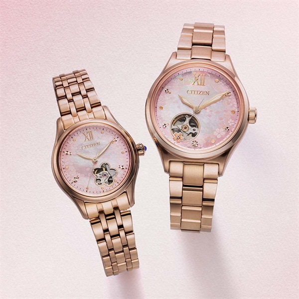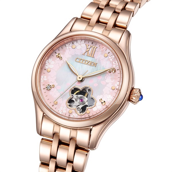 白蝶貝文字板の周囲に満開の桜をグラデーションで表現し、花の隙間からのぞく水面には、ゆるやかに流れる花びらを描きました。メカニカルウオッチならではの動きが楽しめるオープンハート仕様。桜の花の形に切り取られた開口部がアクセントになった特別感のあるデザインに仕上げました。限定モデル1,200本。