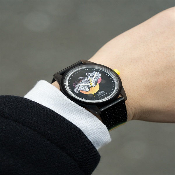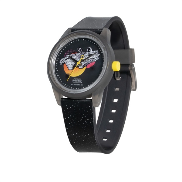 「Q&Q SmileSolar」から「スター・ウォーズ」モデルが登場。【Millennium Falcon】タトゥイーンの2つの太陽をバックにしたミレニアム・ファルコンをデザイン。バンドも宇宙空間をイメージしたデザインです。