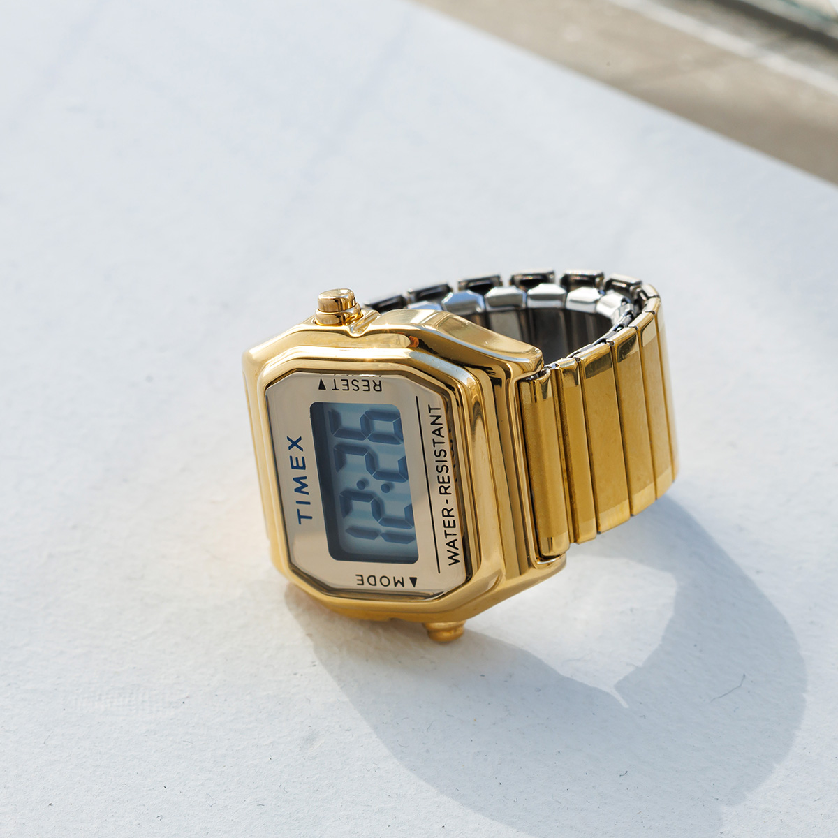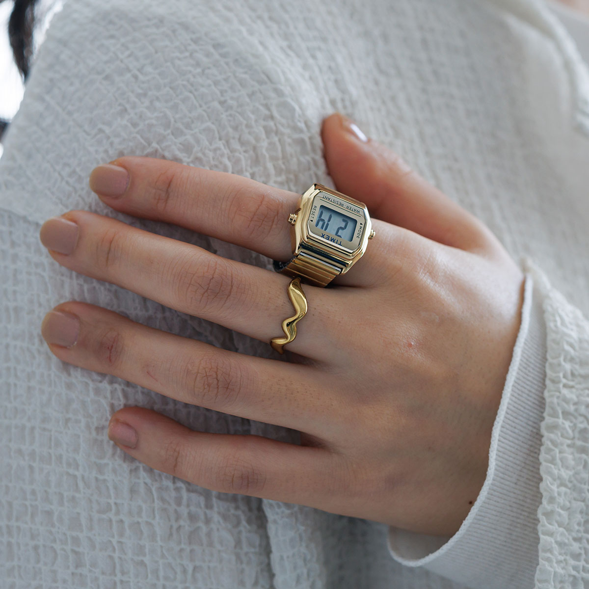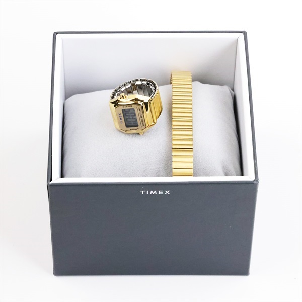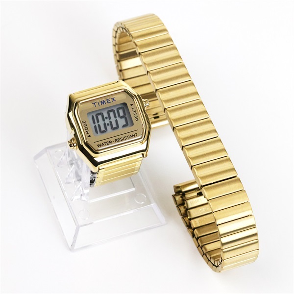 TIMEXの名作「角デジ」のミニサイズ「Mini T80」にショップオリジナルの伸縮式エクスパンションバンドを組み合わせリングウォッチに仕上げたオンタイム・ムーヴだけのカスタマイズしたセットの登場です。伸縮性のタイプなので男性も女性も着けやすいサイズを実現しています。*出荷時はリングウォッチの状態で出荷させていただきます。*サイズ調整は腕時計の状態で調整させていただきます。腕回りのサイズをご指定ください。
