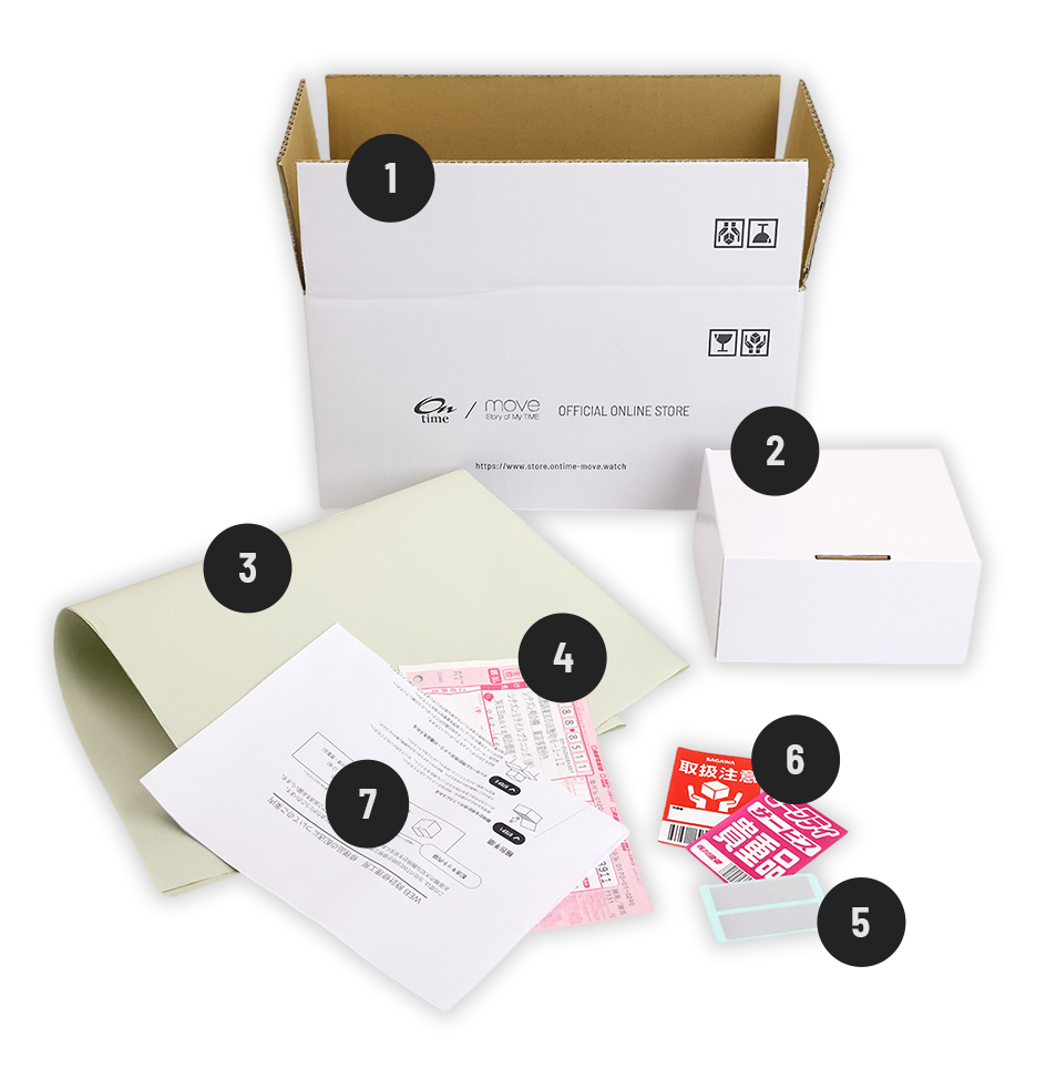※破損の恐れのあるものや、時計サイズの大きいものは無理に箱の中に入れず、配送中に破損しないよう別途クッション材等をご用意いただき、しっかりと包んでください。