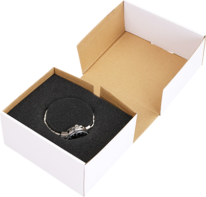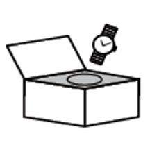 修理をお申込みの時計を、時計用ボックスにいれてください。 ボックス中央にある円柱のスポンジに時計をセットし、ボックス内にいれてください。